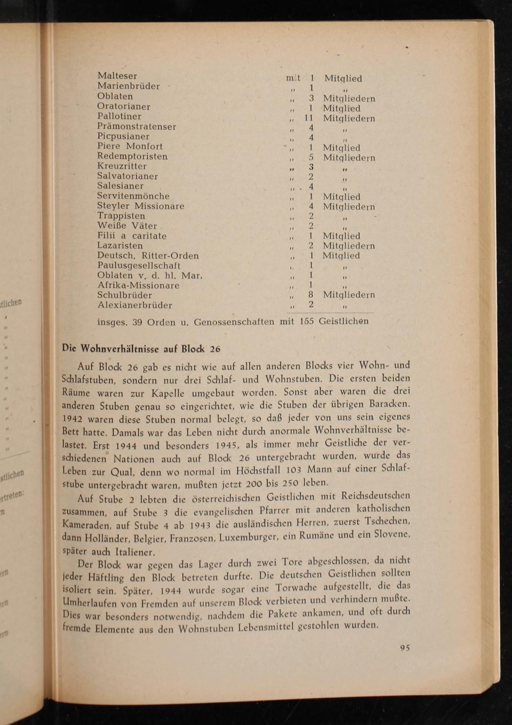 Auf Stube 2 lebten die österreichischen Geistlichen mit Reichsdeutschen zusammen, auf Stube 3 die evangelischen Pfarrer mit anderen katholischen Kameraden, auf Stube 4 ab 1943 die ausländischen Herren, zuerst Tschechen, dann Holländer, Belgier, Franzosen, Luxemburger, ein Rumäne und ein Slovene,