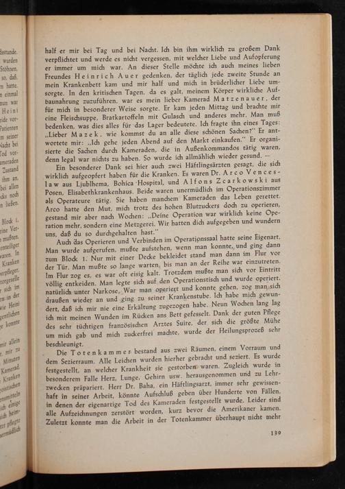 Ein besonderer Dank sei hier auch zwei Häftlingsärzten gesagt, die sich wirklich aufgeopfert haben für die Kranken. Es waren Dr. Arco Venceslaw aus Ljublhema, Bohica Hospital, und Alfons Zcarkowski aus Posen, Elisabethkrankenhaus. Beide waren unermüdlich im Operationszimmer als Operateure tätig. Sie haben manchem Kameraden das Leben gerettet. Arco hatte den Mut, mich trotz des hohen Blutzuckers doch zu operieren, gestand mir aber nach Wochen: ,, Deine Operation war wirklich keine Operation mehr, sondern eine Metzgerei. Wir hatten dich aufgegeben und wundern uns, daß du so durchgehalten hast."