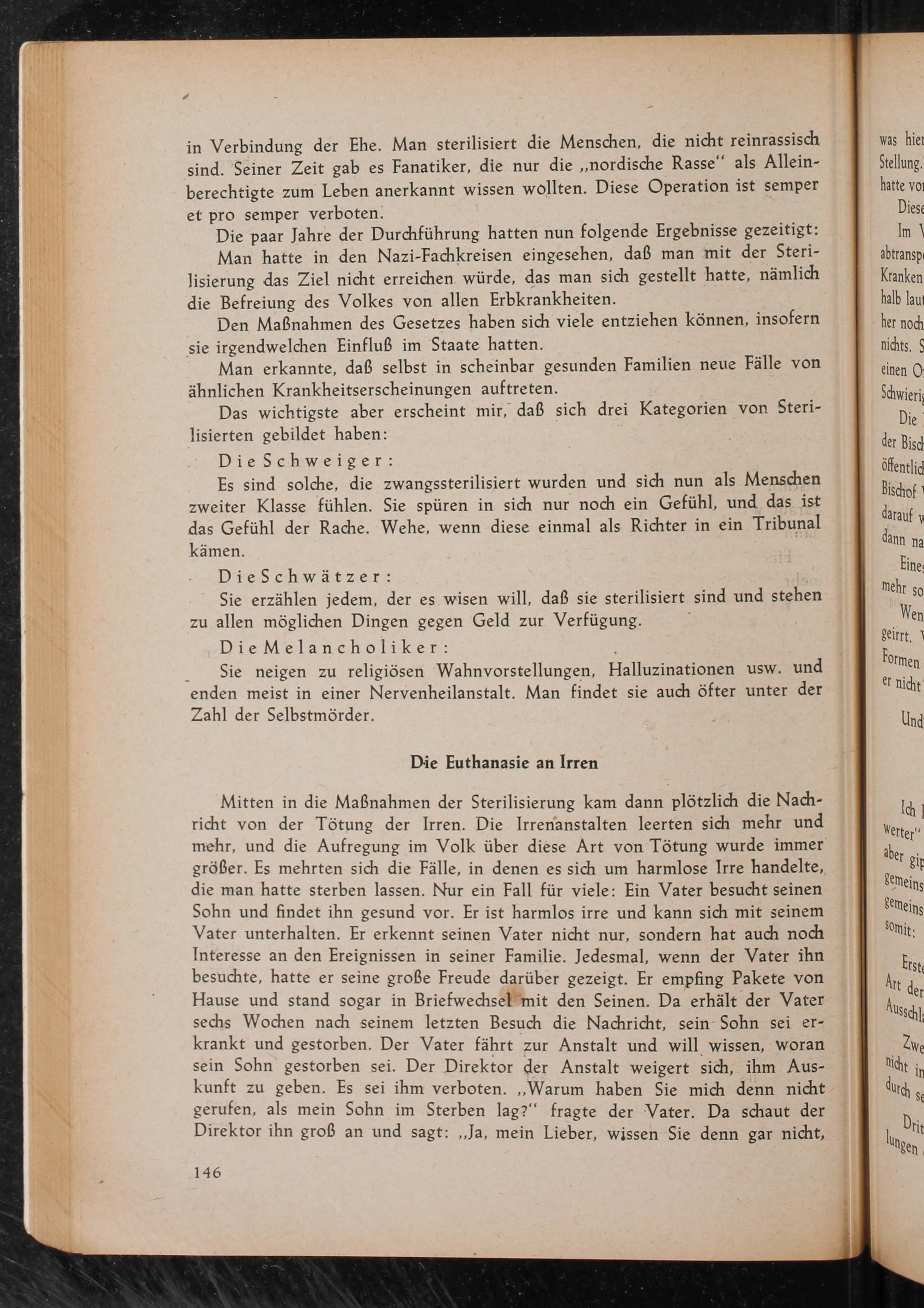 Mitten in die Maßnahmen der Sterilisierung kam dann plötzlich die Nachricht von der Tötung der Irren. Die Irrenanstalten leerten sich mehr und mehr, und die Aufregung im Volk über diese Art von Tötung wurde immer größer. Es mehrten sich die Fälle, in denen es sich um harmlose Irre handelte, die man hatte sterben lassen. Nur ein Fall für viele: Ein Vater besucht seinen Sohn und findet ihn gesund vor. Er ist harmlos irre und kann sich mit seinem Vater unterhalten. Er erkennt seinen Vater nicht nur, sondern hat auch noch Interesse an den Ereignissen in seiner Familie. Jedesmal, wenn der Vater ihn besuchte, hatte er seine große Freude darüber gezeigt. Er empfing Pakete von Hause und stand sogar in Briefwechsel mit den Seinen. Da erhält der Vater sechs Wochen nach seinem letzten Besuch die Nachricht, sein Sohn sei erkrankt und gestorben. Der Vater fährt zur Anstalt und will wissen, woran sein Sohn gestorben sei. Der Direktor der Anstalt weigert sich, ihm Auskunft zu geben. Es sei ihm verboten. ,, Warum haben Sie mich denn nicht gerufen, als mein Sohn im Sterben lag?" fragte der Vater. Da schaut der Direktor ihn groß an und sagt: ,, Ja, mein Lieber, wissen Sie denn gar nicht,