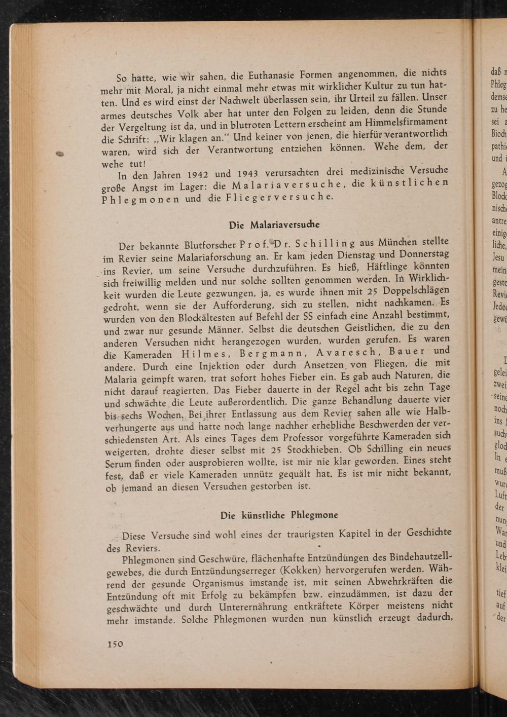 Der bekannte Blutforscher Prof. Dr. Schilling aus München stellte im Revier seine Malariaforschung an. Er kam jeden Dienstag und Donnerstag ins Revier, um seine Versuche durchzuführen. Es hieß, Häftlinge könnten sich freiwillig melden und nur solche sollten genommen werden. In Wirklichkeit wurden die Leute gezwungen, ja, es wurde ihnen mit 25 Doppelschlägen gedroht, wenn sie der Aufforderung, sich zu stellen, nicht nachkamen. Es wurden von den Blockältesten auf Befehl der SS einfach eine Anzahl bestimmt, und zwar nur gesunde Männer. Selbst die deutschen Geistlichen, die zu den anderen Versuchen nicht herangezogen wurden, wurden gerufen. Es waren die Kameraden Hilmes, Bergmann, Avaresch, Bauer und andere. Durch eine Injektion oder durch Ansetzen von Fliegen, die mit Malaria geimpft waren, trat sofort hohes Fieber ein. Es gab auch Naturen, die nicht darauf reagierten. Das Fieber dauerte in der Regel acht bis zehn Tage und schwächte, die Leute außerordentlich. Die ganze Behandlung dauerte vier bis sechs Wochen, Bei ihrer Entlassung aus dem Revier sahen alle wie Halbverhungerte aus und hatte noch lange nachher erhebliche Beschwerden der verschiedensten Art. Als eines Tages dem Professor vorgeführte Kameraden sich weigerten, drohte dieser selbst mit 25 Stockhieben. Ob Schilling ein neues Serum finden oder ausprobieren wollte, ist mir nie klar geworden. Eines steht fest, daß er viele Kameraden unnütz gequält hat. Es ist mir nicht bekannt, ob jemand an diesen Versuchen gestorben ist.
