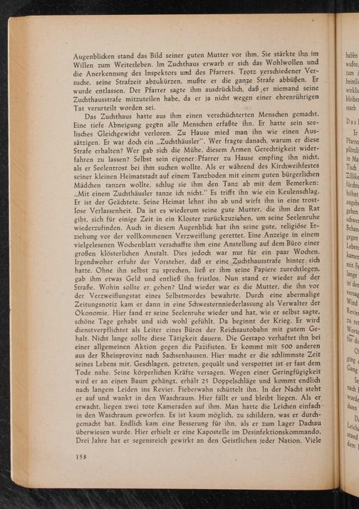 Das Zuchthaus hatte aus ihm einen verschüchterten Menschen gemacht. Eine tiefe Abneigung gegen alle Menschen erfaßte ihn. Er hatte sein seelisches Gleichgewicht verloren. Zu Hause mied man ihn wie einen Aussätzigen. Er war doch ein ,, Zuchthäusler". Wer fragte danach, warum er diese Strafe erhalten? Wer gab sich die Mühe, diesem Armen Gerechtigkeit widerfahren zu lassen? Selbst sein eigener Pfarrer zu Hause empfing ihn nicht, als er Seelentrost bei ihm suchen wollte. Als er während des Kirchweihfestes seiner kleinen Heimatstadt auf einem Tanzboden mit einem guten bürgerlichen Mädchen tanzen wollte, schlug sie ihm den Tanz ab mit dem Bemerken: ,, Mit einem Zuchthäusler tanze ich nicht." Es trifft ihn wie ein Keulenschlag. Er ist der Geächtete. Seine Heimat lehnt ihn ab und wirft ihn in eine trostlose Verlassenheit. Da ist es wiederum seine gute Mutter, die ihm den Rat gibt, sich für einige Zeit in ein Kloster zurückzuziehen, um seine Seelenruhe wiederzufinden. Auch in diesem Augenblick hat ihn seine gute, religiöse Erziehung vor der vollkommenen Verzweiflung gerettet. Eine Anzeige in einem vielgelesenen Wochenblatt verschaffte ihm eine Anstellung auf dem Büro einer großen klösterlichen Anstalt. Dies jedoch war nur für ein paar Wochen. Irgendwoher erfuhr der Vorsteher, daß er eine Zuchthausstrafe hinter sich hatte. Ohne ihn selbst zu sprechen, ließ er ihm seine Papiere zurechtlegen, gab ihm etwas Geld und entließ ihn fristlos. Nun stand er wieder auf der Straße. Wohin sollte er gehen? Und wieder war es die Mutter, die ihn vor der Verzweiflungstat eines Selbstmordes bewahrte. Durch eine abermalige Zeitungsnotiz kam er dann in eine Schwesternniederlassung als Verwalter der Ökonomie. Hier fand er seine Seelenruhe wieder und hat, wie er selbst sagte, schöne Tage gehabt und sich wohl gefühlt. Da beginnt der Krieg. Er wird dienstverpflichtet als Leiter eines Büros der Reichsautobahn mit gutem Gehalt. Nicht lange sollte diese Tätigkeit dauern. Die Gestapo verhaftet ihn bei einer allgemeinen Aktion gegen die Pazifisten. Er kommt mit 500 anderen aus der Rheinprovinz nach Sachsenhausen. Hier macht er die schlimmste Zeit seines Lebens mit. Geschlagen, getreten, gequält und verspottet ist er fast dem Tode nahe. Seine körperlichen Kräfte versagen. Wegen einer Geringfügigkeit wird er an einen Baum gehängt, erhält 25 Doppelschläge und kommt endlich nach langem Leiden ins Revier. Fieberwahn schüttelt ihn. In der Nacht steht er auf und wankt in den Waschraum. Hier fällt er und bleibt liegen. Als er erwacht, liegen zwei tote Kameraden auf ihm. Man hatte die Leichen einfach in den Waschraum geworfen. Es ist kaum möglich, zu schildern, was er durchgemacht hat. Endlich kam eine Besserung für ihn, als er zum Lager Dachau überwiesen wurde. Hier erhielt er eine Kapostelle im Desinfektionskommando. Drei Jahre hat er segensreich gewirkt an den Geistlichen jeder Nation. Viele