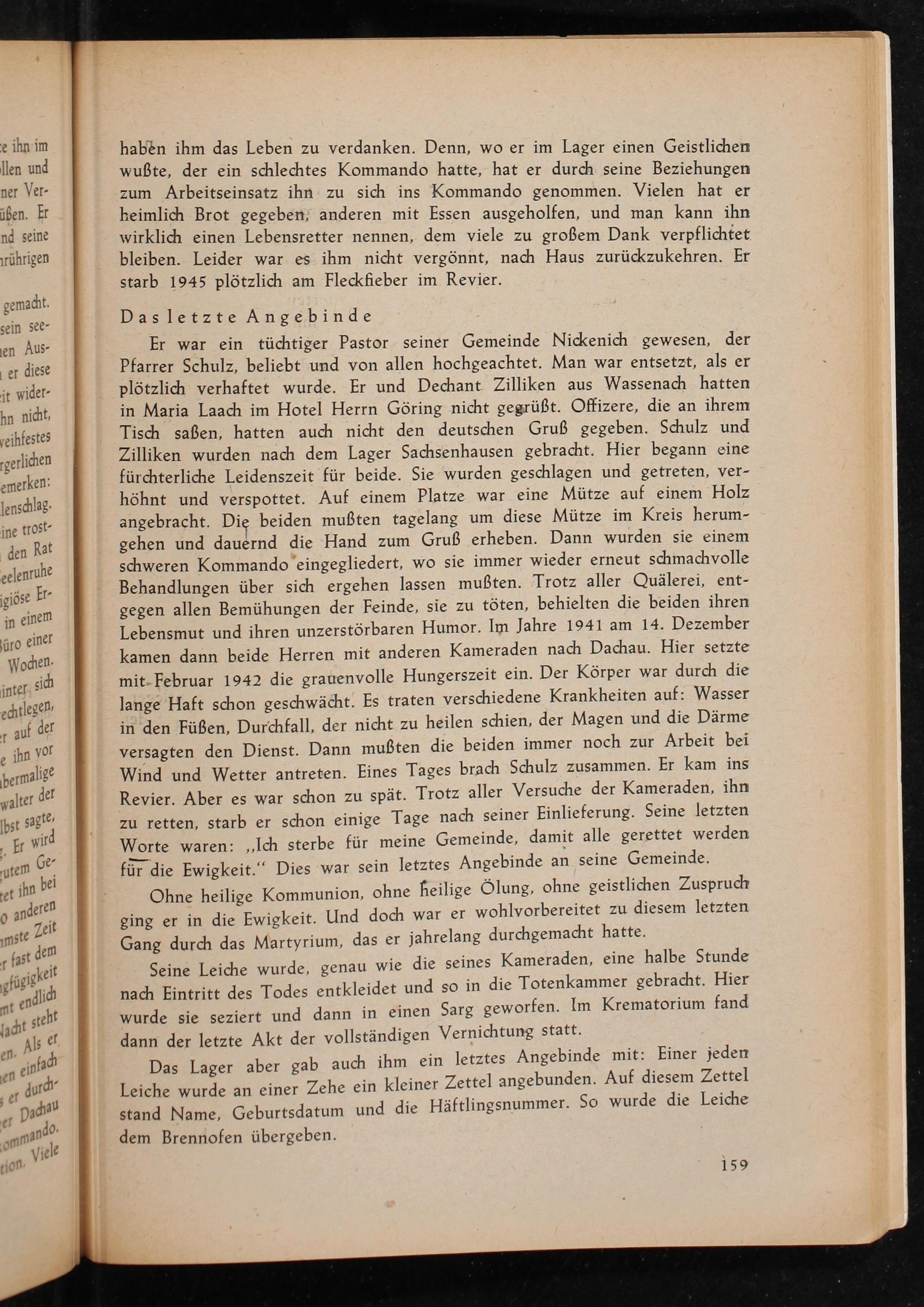 Er war ein tüchtiger Pastor seiner Gemeinde Nickenich gewesen, der Pfarrer Schulz, beliebt und von allen hochgeachtet. Man war entsetzt, als er plötzlich verhaftet wurde. Er und Dechant Zilliken aus Wassenach hatten in Maria Laach im Hotel Herrn Göring nicht gegrüßt. Offizere, die an ihrem Tisch saßen, hatten auch nicht den deutschen Gruß gegeben. Schulz und Zilliken wurden nach dem Lager Sachsenhausen gebracht. Hier begann eine fürchterliche Leidenszeit für beide. Sie wurden geschlagen und getreten, verhöhnt und verspottet. Auf einem Platze war eine Mütze auf einem Holz angebracht. Die beiden mußten tagelang um diese Mütze im Kreis herumgehen und dauernd die Hand zum Gruß erheben. Dann wurden sie einem schweren Kommando eingegliedert, wo sie immer wieder erneut schmachvolle Behandlungen über sich ergehen lassen mußten. Trotz aller Quälerei, entgegen allen Bemühungen der Feinde, sie zu töten, behielten die beiden ihren Lebensmut und ihren unzerstörbaren Humor. Im Jahre 1941 am 14. Dezember kamen dann beide Herren mit anderen Kameraden nach Dachau . Hier setzte mit Februar 1942 die grauenvolle Hungerszeit ein. Der Körper war durch die lange Haft schon geschwächt. Es traten verschiedene Krankheiten auf: Wasser in den Füßen, Durchfall, der nicht zu heilen schien, der Magen und die Därme versagten den Dienst. Dann mußten die beiden immer noch zur Arbeit bei Wind und Wetter antreten. Eines Tages brach Schulz zusammen. Er kam ins Revier. Aber es war schon zu spät. Trotz aller Versuche der Kameraden, ihn zu retten, starb er schon einige Tage nach seiner Einlieferung. Seine letzten Worte waren: ,, Ich sterbe für meine Gemeinde, damit alle gerettet werden für die Ewigkeit." Dies war sein letztes Angebinde an seine Gemeinde.