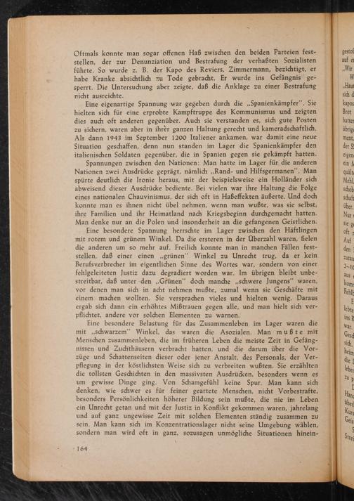 Oftmals konnte man sogar offenen Haß zwischen den beiden Parteien feststellen, der zur Denunziation und Bestrafung der verhaßten Sozialisten führte. So wurde z. B. der Kapo des Reviers, Zimmermann, bezichtigt, er habe Kranke absichtlich zu Tode gebracht. Er wurde ins Gefängnis gesperrt. Die Untersuchung aber zeigte, daß die Anklage zu einer Bestrafung nicht ausreichte.
