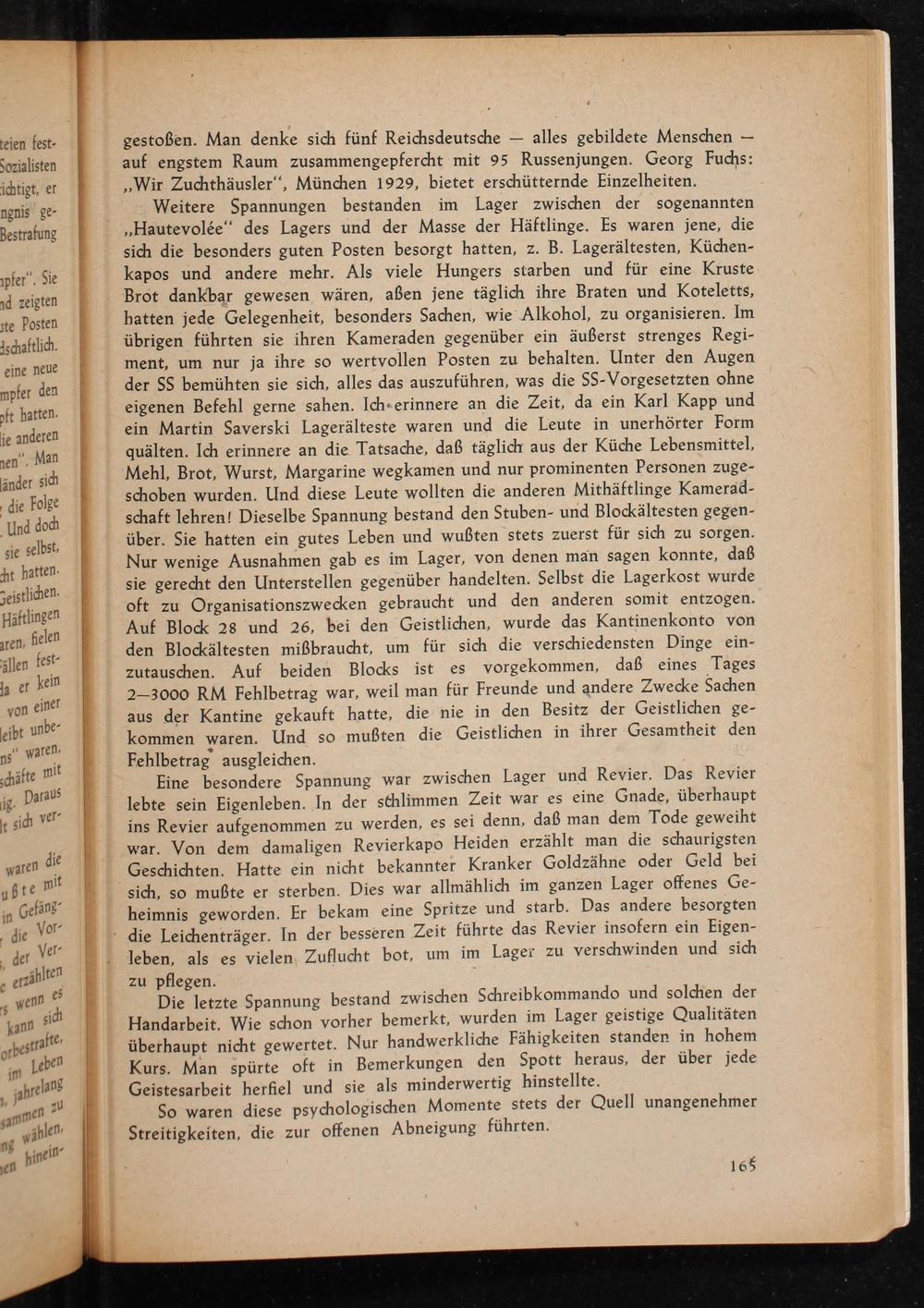 Weitere Spannungen bestanden im Lager zwischen der sogenannten ,, Hautevolée " des Lagers und der Masse der Häftlinge. Es waren jene, die sich die besonders guten Posten besorgt hatten, z. B. Lagerältesten, Küchenkapos und andere mehr. Als viele Hungers starben und für eine Kruste Brot dankbar gewesen wären, aßen jene täglich ihre Braten und Koteletts, hatten jede Gelegenheit, besonders Sachen, wie Alkohol, zu organisieren. Im übrigen führten sie ihren Kameraden gegenüber ein äußerst strenges Regiment, um nur ja ihre so wertvollen Posten zu behalten. Unter den Augen der SS bemühten sie sich, alles das auszuführen, was die SS- Vorgesetzten ohne eigenen Befehl gerne sahen. Ich erinnere an die Zeit, da ein Karl Kapp und ein Martin Saverski Lagerälteste waren und die Leute in unerhörter Form quälten. Ich erinnere an die Tatsache, daß täglich aus der Küche Lebensmittel, Mehl, Brot, Wurst, Margarine wegkamen und nur prominenten Personen zugeschoben wurden. Und diese Leute wollten die anderen Mithäftlinge Kameradschaft lehren! Dieselbe Spannung bestand den Stuben- und Blockältesten gegenüber. Sie hatten ein gutes Leben und wußten stets zuerst für sich zu sorgen. Nur wenige Ausnahmen gab es im Lager, von denen man sagen konnte, daß sie gerecht den Unterstellen gegenüber handelten. Selbst die Lagerkost wurde oft zu Organisationszwecken gebraucht und den anderen somit entzogen. Auf Block 28 und 26, bei den Geistlichen, wurde das Kantinenkonto von den Blockältesten mißbraucht, um für sich die verschiedensten Dinge einzutauschen. Auf beiden Blocks ist es vorgekommen, daß eines Tages 2-3000 RM Fehlbetrag war, weil man für Freunde und andere Zwecke Sachen aus der Kantine gekauft hatte, die nie in den Besitz der Geistlichen gekommen waren. Und so mußten die Geistlichen in ihrer Gesamtheit den Fehlbetrag ausgleichen.