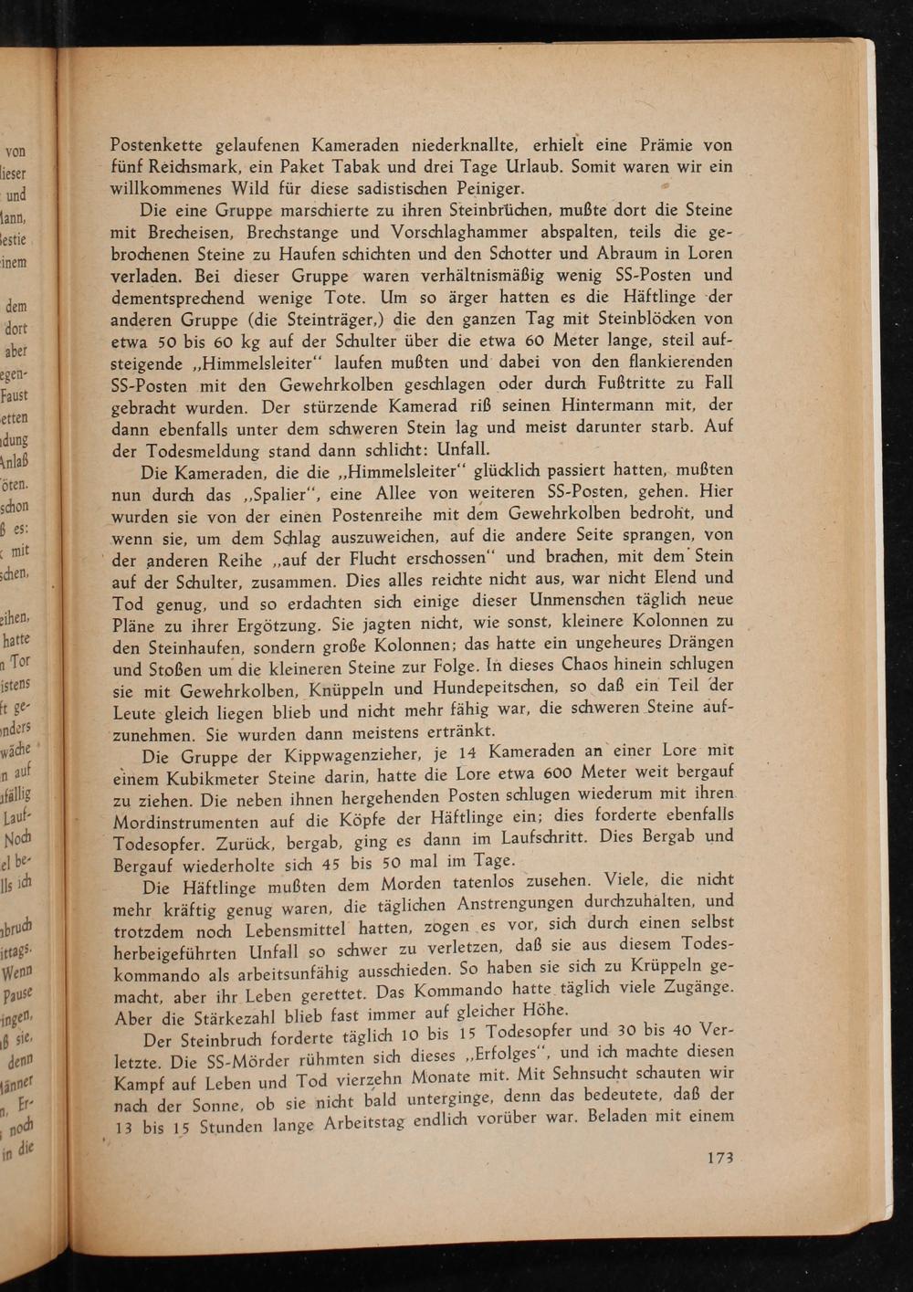 Die Kameraden, die die ,, Himmelsleiter" glücklich passiert hatten, mußten nun durch das ,, Spalier", eine Allee von weiteren SS- Posten, gehen. Hier wurden sie von der einen Postenreihe mit dem Gewehrkolben bedroht, und wenn sie, um dem Schlag auszuweichen, auf die andere Seite sprangen, von der anderen Reihe ,, auf der Flucht erschossen" und brachen, mit dem Stein auf der Schulter, zusammen. Dies alles reichte nicht aus, war nicht Elend und Tod genug, und so erdachten sich einige dieser Unmenschen täglich neue Pläne zu ihrer Ergötzung. Sie jagten nicht, wie sonst, kleinere Kolonnen zu den Steinhaufen, sondern große Kolonnen; das hatte ein ungeheures Drängen und Stoßen um die kleineren Steine zur Folge. In dieses Chaos hinein schlugen sie mit Gewehrkolben, Knüppeln und Hundepeitschen, so daß ein Teil der Leute gleich liegen blieb und nicht mehr fähig war, die schweren Steine aufzunehmen. Sie wurden dann meistens ertränkt.