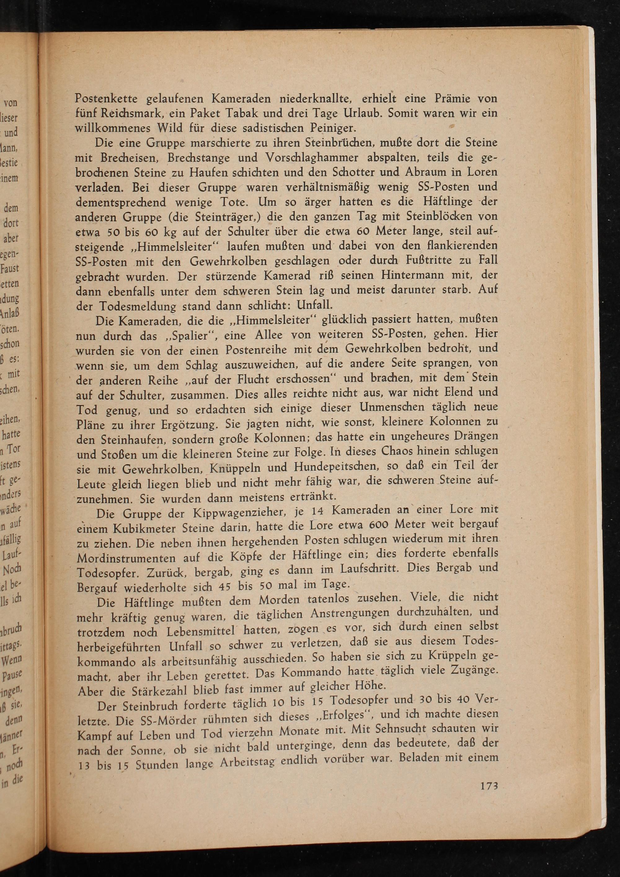 Der Steinbruch forderte täglich 10 bis 15 Todesopfer und 30 bis 40 Verletzte. Die SS - Mörder rühmten sich dieses ,, Erfolges", und ich machte diesen Kampf auf Leben und Tod vierzehn Monate mit. Mit Sehnsucht schauten wir nach der Sonne, ob sie nicht bald unterginge, denn das bedeutete, daß der 13 bis 15 Stunden lange Arbeitstag endlich vorüber war. Beladen mit einem
