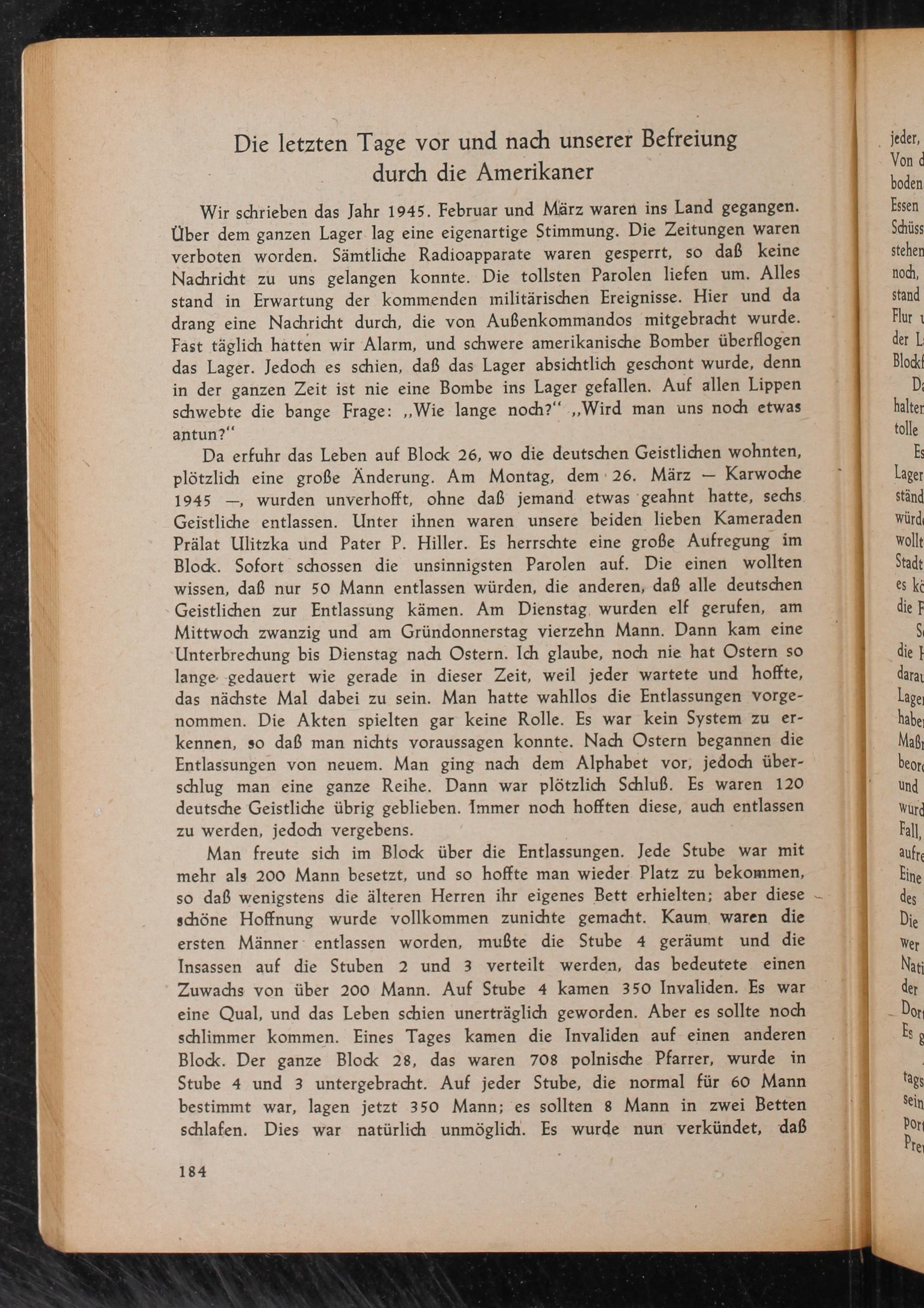 Da erfuhr das Leben auf Block 26, wo die deutschen Geistlichen wohnten, plötzlich eine große Änderung. Am Montag, dem 26. März- Karwoche 1945- wurden unverhofft, ohne daß jemand etwas geahnt hatte, sechs. Geistliche entlassen. Unter ihnen waren unsere beiden lieben Kameraden Prälat Ulitzka und Pater P. Hiller. Es herrschte eine große Aufregung im Block. Sofort schossen die unsinnigsten Parolen auf. Die einen wollten wissen, daß nur 50 Mann entlassen würden, die anderen, daß alle deutschen Geistlichen zur Entlassung kämen. Am Dienstag, wurden elf gerufen, am Mittwoch zwanzig und am Gründonnerstag vierzehn Mann. Dann kam eine Unterbrechung bis Dienstag nach Ostern. Ich glaube, noch nie hat Ostern so lange gedauert wie gerade in dieser Zeit, weil jeder wartete und hoffte, das nächste Mal dabei zu sein. Man hatte wahllos die Entlassungen vorgenommen. Die Akten spielten gar keine Rolle. Es war kein System zu erkennen, so daß man nichts voraussagen konnte. Nach Ostern begannen die Entlassungen von neuem. Man ging nach dem Alphabet vor, jedoch überschlug man eine ganze Reihe. Dann war plötzlich Schluß. Es waren 120 deutsche Geistliche übrig geblieben. Immer noch hofften diese, auch entlassen zu werden, jedoch vergebens.
