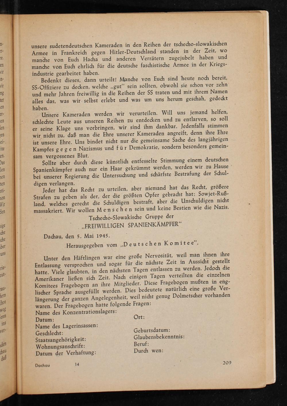 Unsere Kameraden werden wir verurteilen. Will uns jemand helfen, schlechte Leute aus unseren Reihen zu entdecken und zu entlarven, so soll er seine Klage uns vorbringen, wir sind ihm dankbar. Jedenfalls stimmen wir nicht zu, daß man die Ehre unserer Kameraden angreift, denn ihre Ehre ist unsere Ehre. Uns bindet nicht nur die gemeinsame Sache des langjährigen Kampfes gegen Nazismus und für Demokratie, sondern besonders gemein- sam vergossenes Blut.
