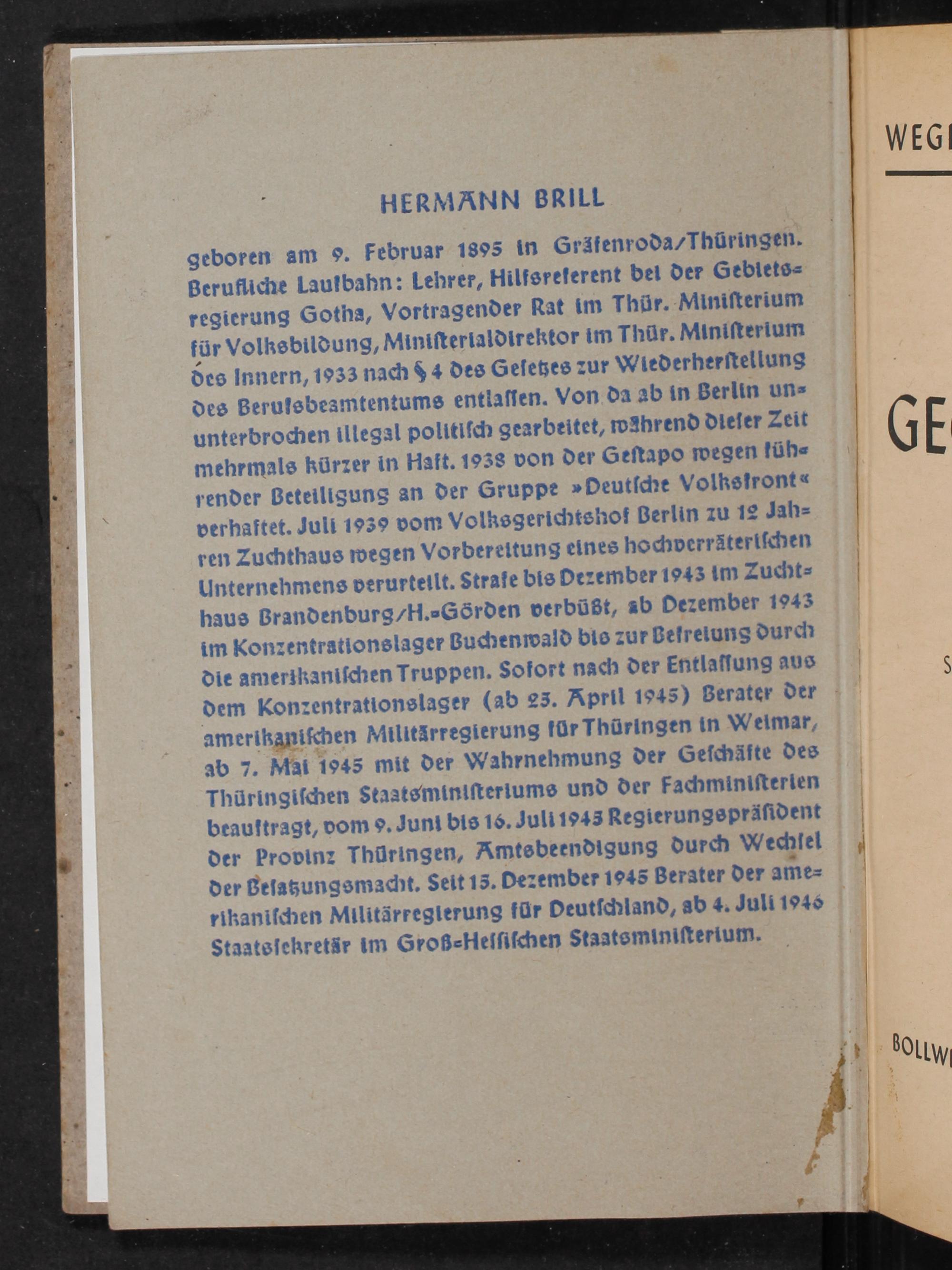 geboren am 9. Februar 1895 in Gräfenroda/Thüringen . Berufliche Laufbahn: Lehrer, Hilfsreferent bel der Geblets= regierung Gotha, Vortragendey Rat im Thür.- Miniſterium für Volksebildung, Miniſterlaldirektor im Thür. Miniſterium des Innern, 1933 nach$ 4 des Geſetzes zur Wiederherſtellung des Berufsbeamtentums entlaſſen. Von da 2b in Berlin un= unterbrochen illegal politiſch gearbeitet, roZhrend dieſer Zeit mehremals kürzer in Haft. 1938 vOn der Geſtapo wegen fühe render Beteiliguns an der Gruppe»ODeutſche Volksfront« verhaftet. Juli 1939 vom Volksgerichtehof Berlin zu 12 Jah= ren Zuchthaus wegen Vorbereitung eines hochverräteriſchen Unternehmens verurteilt. Strafe bis Dezember 1943 im Zucht= haus Brandenburg/H .-Görden verbüßt, ab Oezember 1943 im Konzentrationslager Buchenroald bis zur Befreiung durch die amerikaniſchen Truppen. Sofort nach der Entlaſſung aus dem Konzentrationslager(ab 25. April 1945) Berater der amerikaniſchen Militärregierung für Thüringen in Weimar , ab 7. Mai 1945 mit der Wahrnehmung der Geſchäfte des Thüringiſchen Staatsminiſteriums und der Fachminiſterien beauftragt, vom 9, Juni bis 16. Juli 1945 Regierungspräſident der Provinz Thüringen , Amtsbeendigung durch Wechlel der Geſazungsmacht, Seit 15. Dezember 1945 Berater der ame= rikaniſchen Militärregierung für Deutſchland , ab 4. Juli 1946 Staatsſchretär im GroßsHeiſiſchen Staatsminiſterium.