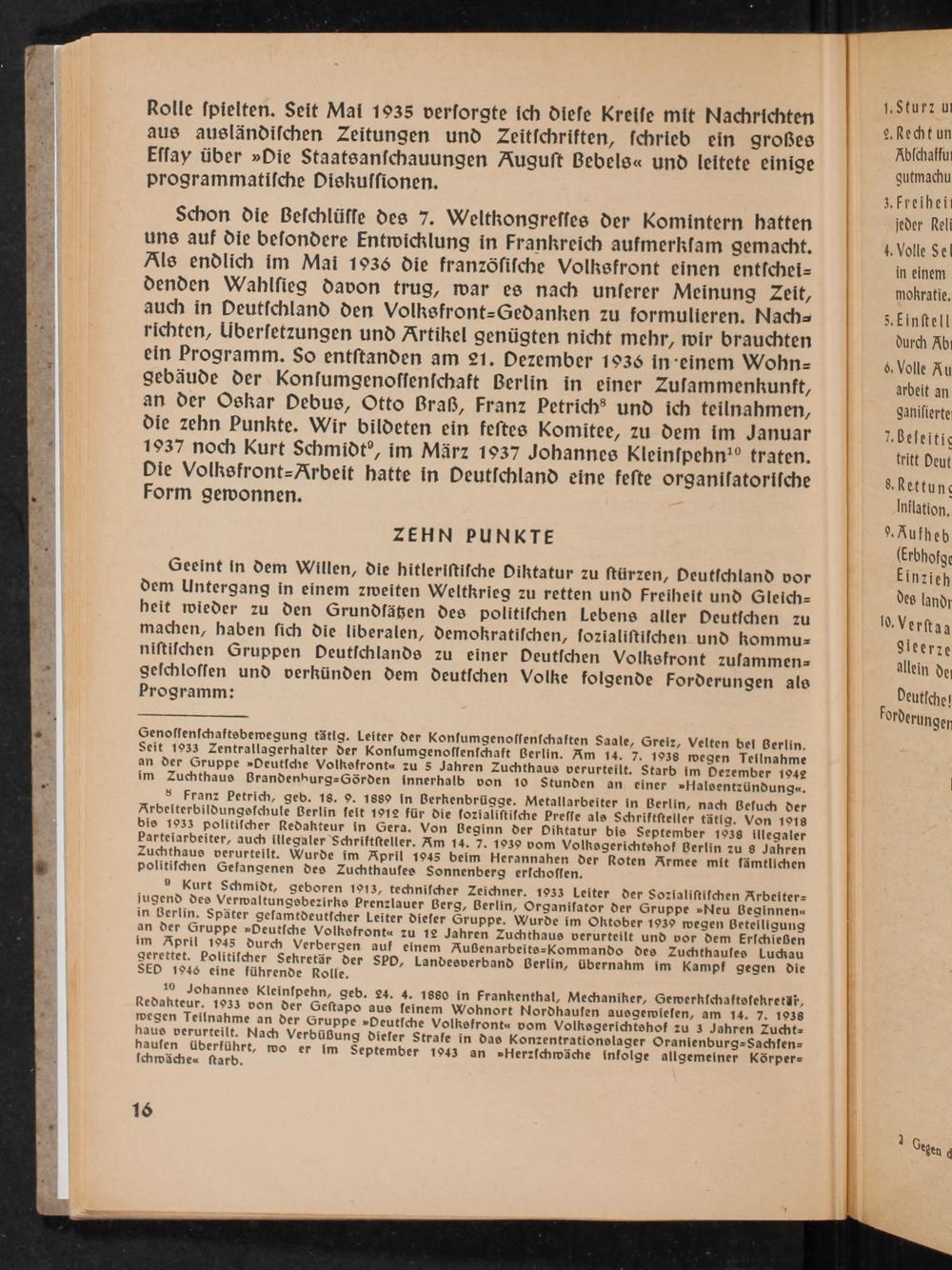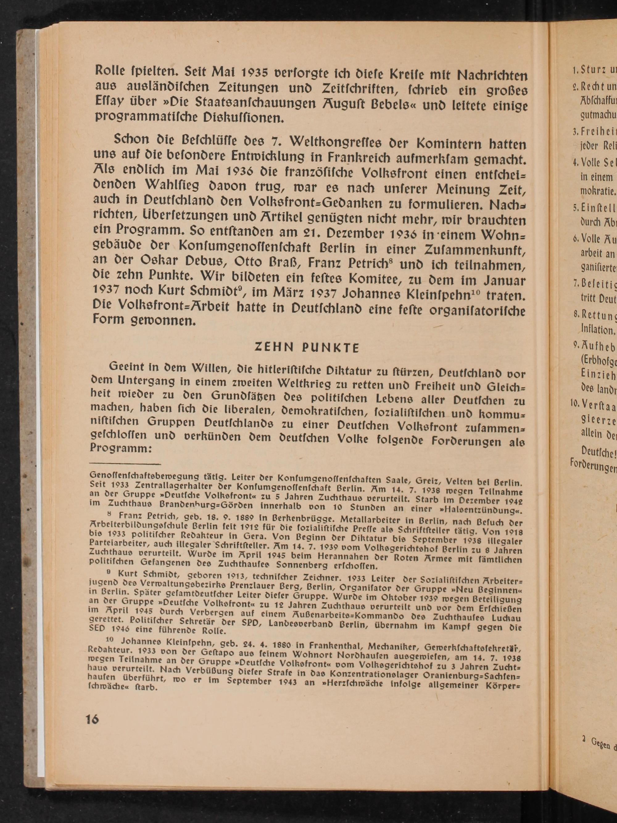 Schon die Beſchlüſſe des 7. Weltkongreſſes der Komintern hatten uns auf die beſondere Entwicklung in Frankreich aufmerkſam gemacht. Als endlich im Mai 1936 die franzöſiſche Volksfront einen entſchei= denden Wahlſieg davon trug, war es nach unſerer Meinung Zeit, auch in Peutſchland den Volksfront=Gedanken zu formulieren. Nach= richten, Überſetzungen und Artikel genügten nicht mehr, wir brauchten ein Programm. So entſtanden am 21. Dezember 1936 in-einem Wohn- gebäude der Konſumgenoſſenſchaft Berlin in einer Zuſammenkunft, an der Oskar Debus, Otto Braß, Franz Petrich ® und ich teilnahmen, die zehn Punkte. Wir bildeten ein feſtes Komitee, zu dem im Januar 1937 noch Kurt Schmidt®, im März 1937 Johannes Kleinſpehn!° traten.