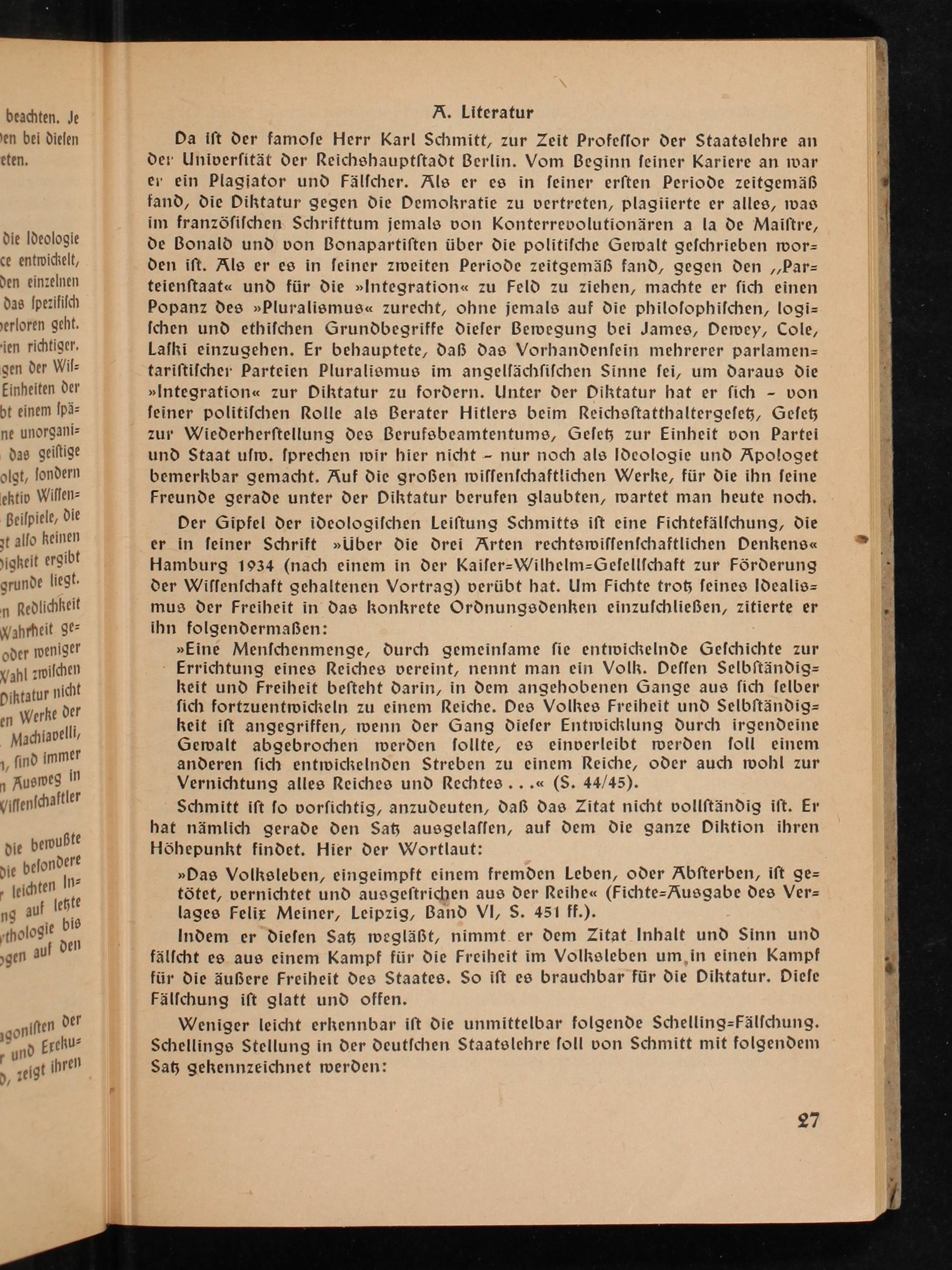 Der Gipfel der ideologiſchen Leiſtung Schmitts iſt eine Fichtefälſchung, die er in ſeiner Schrift»Über die drei Arten rechtswiſſenſchaftlichen Denkens« Hamburg 1934(nach einem in der Kaiſer=Wilhelm=Geſellſchaft zur Förderung der Wiſſenſchaft gehaltenen Vortrag) verübt hat. Um Fichte trotz ſeines Idealis= mus der Freiheit in das konkrete Ordnungsdenken einzuſchließen, zitierte er ihn folgendermaßen:
