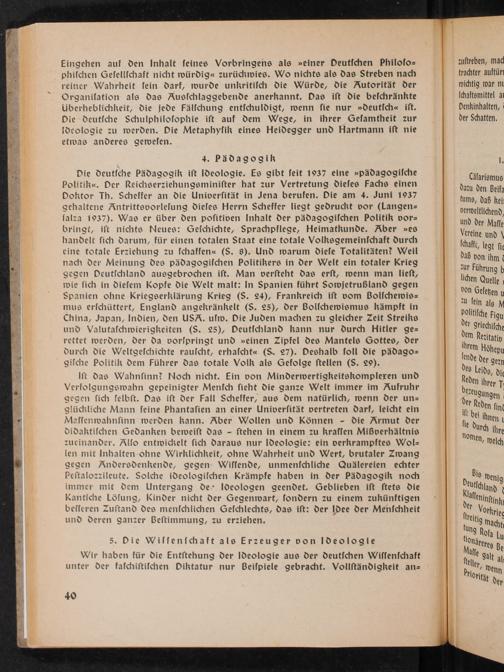 Die deutſche Pädagogik iſt Ideologie. Es gibt ſeit 1937 eine»pädagogiſche Politik«. Der Reichserziehungsminiſter hat zur Vertretung dieſes Fachs einen Doktor Th. Scheffer an die Univerſität in Jena berufen. Die am 4. Juni 1937 tums, daß kei gehaltene Antrittsvorleſung dieſes Herrn Scheffer liegt gedruckt vor(Langen= verweltlichend ſalza 1937). Was er über den poſitiven Inhalt der pädagogiſchen Politik vor= E| und dey Maſte bringt, iſt nichts Neues: Geſchichte, Sprachpflege, Heimatkunde. Aber»es j