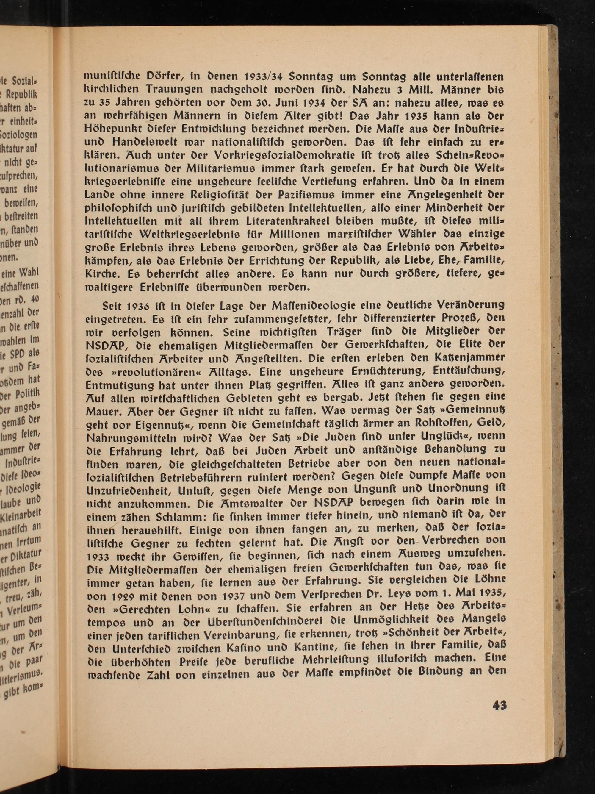 muniſtiſche Dörfer, in denen 1933/34 Sonntag um Sonntag alle unterlaſſenen kirchlichen Trauungen nachgeholt worden ſind. Nahezu 3 Mill. Männer bis zu 35 Jahren gehörten vor dem 30. Juni 1934 der SA an: nahezu alles, was es an wehrfähigen Männern in dieſem Alter gibt! Das Jahr 1935 kann als der Höhepunkt dieſer Entwicklung bezeichnet werden. Die Maſſe aus der Induſtrie= und Handelswelt war nationaliſtiſch geworden. Das iſt ſehr einfach zu er- klären. Auch unter der Vorkriegsſozialdemokratie iſt trot alles Schein=Revo= lutionarismus der Militarismus immer ſtark geweſen. Er hat durch die Welt= kriegserlebniſſe eine ungeheure ſeeliſche Vertiefung erfahren. Und da in einem Lande ohne innere Religioſität der Pazifismus immer eine Angelegenheit der philoſophiſch und juriſtiſch gebildeten Intellektuellen, alſo einer Minderheit der Intellektuellen mit all ihrem Literatenkrakeel bleiben mußte, iſt dieſes mili= tariſtiſche Weltkriegserlebnis für Millionen marxiſtiſcher Wähler das einzige große Erlebnis ihres Lebens geworden, größer als das Erlebnis von Arbeits=- kämpfen, als das Erlebnis der Errichtung der Republik , als Liebe, Ehe, Familie, Kirche. Es beherrſcht alles andere. Es kann nur durch größere, tiefere, ges mwaltigere Erlebniſſe überwunden werden.