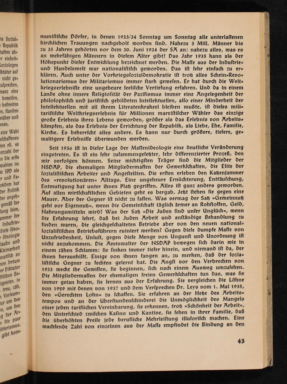 muniſtiſche Dörfer, in denen 1933/34 Sonntag um Sonntag alle unterlaſſenen kirchlichen Trauungen nachgeholt worden ſind. Nahezu 3 Mill. Männer bis zu 35 Jahren gehörten vor dem 30. Juni 1934 der SA an: nahezu alles, was es an wehrfähigen Männern in dieſem Alter gibt! Das Jahr 1935 kann als der Höhepunkt dieſer Entwicklung bezeichnet werden. Die Maſſe aus der Induſtrie= und Handelswelt war nationaliſtiſch geworden. Das iſt ſehr einfach zu er- klären. Auch unter der Vorkriegsſozialdemokratie iſt trot alles Schein=Revo= lutionarismus der Militarismus immer ſtark geweſen. Er hat durch die Welt= kriegserlebniſſe eine ungeheure ſeeliſche Vertiefung erfahren. Und da in einem Lande ohne innere Religioſität der Pazifismus immer eine Angelegenheit der philoſophiſch und juriſtiſch gebildeten Intellektuellen, alſo einer Minderheit der Intellektuellen mit all ihrem Literatenkrakeel bleiben mußte, iſt dieſes mili= tariſtiſche Weltkriegserlebnis für Millionen marxiſtiſcher Wähler das einzige große Erlebnis ihres Lebens geworden, größer als das Erlebnis von Arbeits=- kämpfen, als das Erlebnis der Errichtung der Republik , als Liebe, Ehe, Familie, Kirche. Es beherrſcht alles andere. Es kann nur durch größere, tiefere, ges mwaltigere Erlebniſſe überwunden werden.