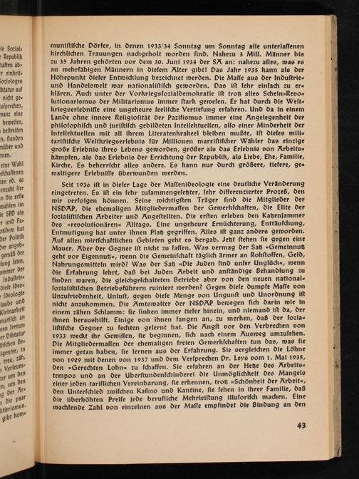 Seit 1936 iſt in dieſer Lage der Maſſenideologie eine deutliche Veränderung eingetreten. Es iſt ein ſehr zuſammengeſeßter, ſehr differenzierter Prozeß, den wir verfolgen können. Seine wichtigſten Träger ſind die Mitglieder der NSDADP, die ehemaligen Mitgliedermaſſen der Gewerkſchaften, die Elite der ſozialiſtiſchen Arbeiter und Angeſtellten. Oie erſten erleben den Katzenjammer des»revolutionären« Alltags. Eine ungeheure Ernüchterung, Enttäuſchung, Entmutigung hat unter ihnen Plag gegriffen. Alles iſt ganz anders geworden. Auf allen wirtſchaftlichen Gebieten geht es bergab. Jetzt ſtehen ſie gegen eine Mauer. Aber der Gegner iſt nicht zu faſſen. Was vermag der Sat»Gemeinnuß geht vor Eigennuß«, wenn die Gemeinſchaft täglich ärmer an Rohſtoffen, Geld, Nahrungsmitteln wird? Was der Satz»Die Juden ſind unſer Unglück«, wenn die Erfahrung lehrt, daß bei Juden Arbeit und anſtändige Behandlung zu finden waren, die gleichgeſchalteten Betriebe aber von den neuen national= ſozialiſtiſchen Betriebsführern ruiniert werden? Gegen dieſe dumpfe Maſſe von Unzufriedenheit, Unluſt, gegen dieſe Menge von Ungunſt und Unordnung iſt nicht anzukommen. Die Amtsmwalter der NSOAP bewegen ſich darin wie in einem zähen Schlamm: ſie ſinken immer tiefer hinein, und niemand iſt da, der ihneú heraushilft, Einige von ihnen fangen an, zu merken, daß der ſozia= liſtiſche Gegner zu fechten gelernt hat. Die Angſt vor den Verbrechen von 1933 weckt ihr Gewiſſen, ſie beginnen, ſich nach einem Ausweg umzuſehen. Pie Mitgliedermaſſen der ehenialigen freien Gewerkſchaften tun das, was ſie immer getan haben, ſie lernen aus der Erfahrung. Sie vergleichen die Löhne von 1929 mit denen von 1937 und dem Verſprechen Or. Leys vom 1. Mal 1935, den»Gerechten Lohn« zu ſchaffen. Sie erfahren an der Hetze des Arbeits=- tempos und an der Überſtundenſchinderei die Unmöglichkeit des Mangels einer jeden tariflichen Vereinbarung, ſie erkennen, troß»Schönheit der Arbeit «, den Unterſchied zwiſchen Kaſino und Kantine, ſie ſehen in ihrer Familie, daß die überhöhten Preiſe jede berufliche Mehrleiſtung illuſoriſch machen. Eine wachſende Zahl von einzelnen aus der Maſſe empfindet die Bindung an den
