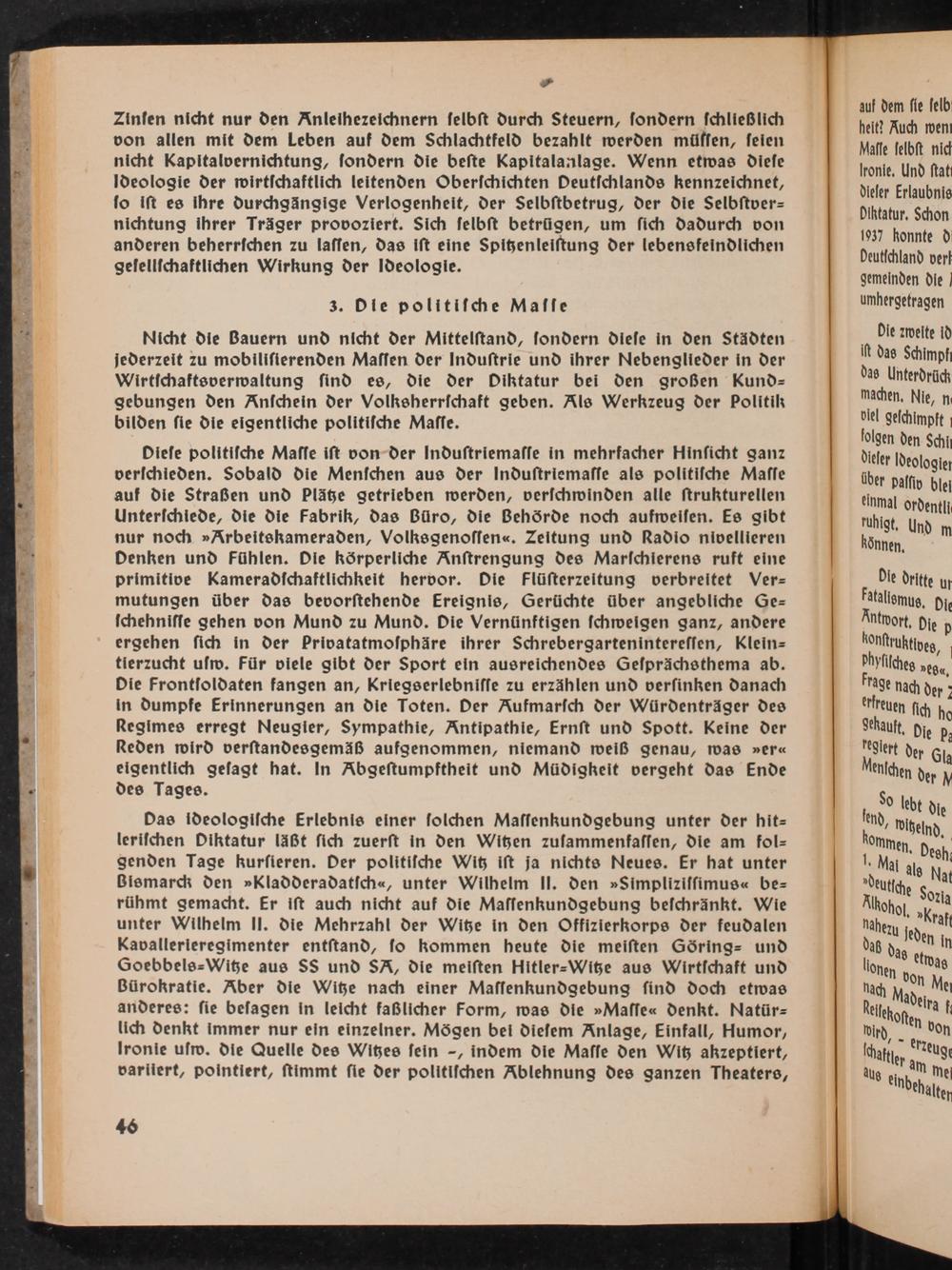 Das ideologiſche Erlebnis einer ſolchen Maſſenkundgebung unter der hit= leriſchen Diktatur läßt ſich zuerſt in den Witßen zuſammenfaſſen, die am fol= genden Tage Rurſieren. Der politiſche Wit iſt ja nichts Neues. Er hat unter Bismarck den»Kladderadatſch«, unter Wilhelm Il. den»Simpliziſſimus« be= rühmt gemacht. Er iſt auch nicht auf die Maſſenkundgebung beſchränkt. Wie unter Wilhelm II. die Mehrzahl der Wiße in den Offizierkorps der feudalen Kavallerieregimenter entſtand, ſo kommen heute die meiſten Göring= und Goebbels-=Witze aus SS und SA , die meiſten Hitler=Witze aus Wirtſchaft und Bürokratie. Aber die Wiße nach einer Maſſenkundgebung ſind doch etwas anderes: ſie beſagen in leicht faßlicher Form, was die»Maſſe« denkt. Natür= lich denkt immer nur ein einzelner. Mögen bei dieſem Anlage, Einfall, Humor, Ironie uſr. die Quelle des Witzes ſein-, indem die Maſſe den Wißt akzeptiert, variiert, pointiert, ſtimmt ſie der politiſchen Ablehnung des ganzen Theaters,