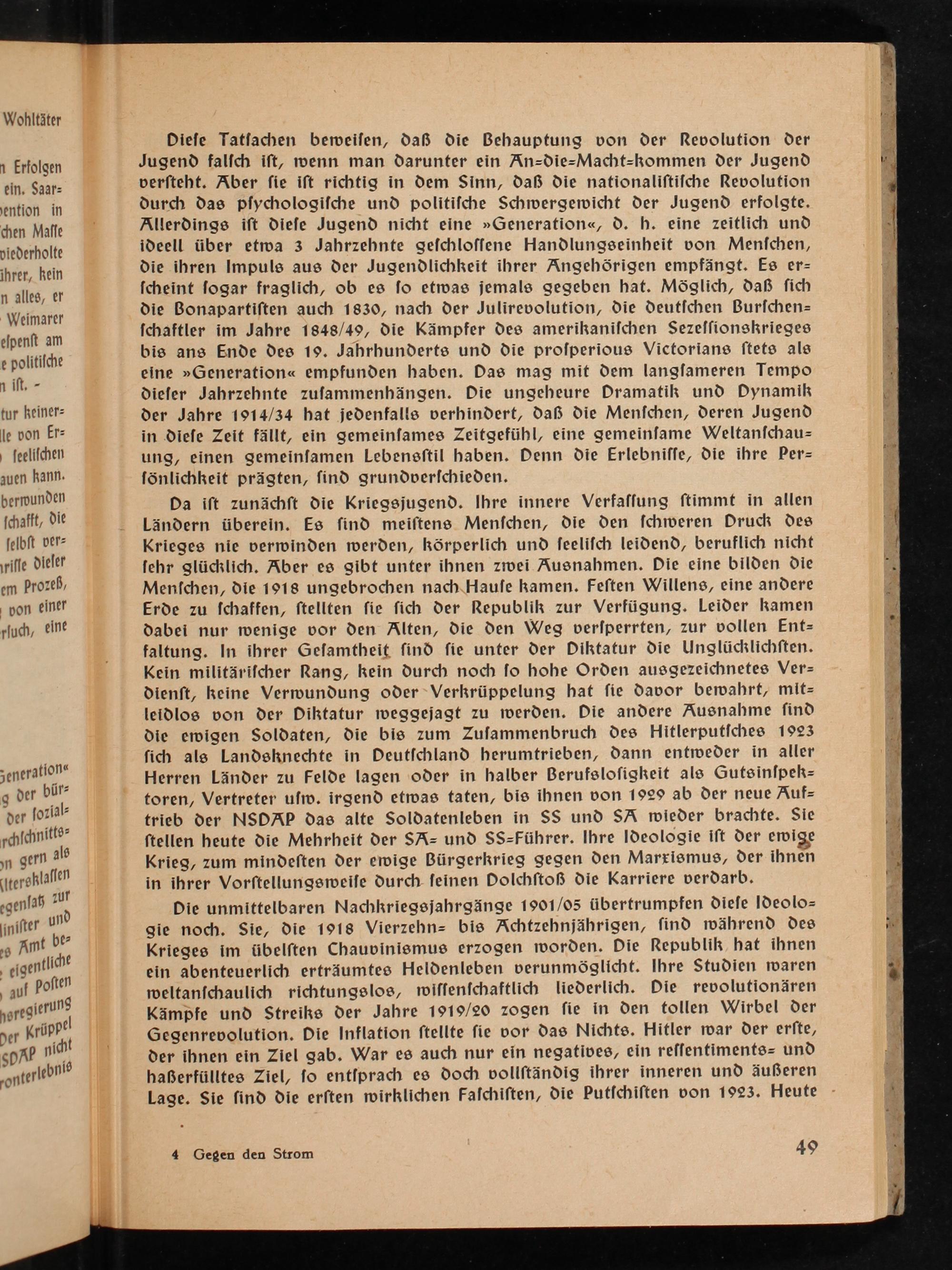 Die unmittelbaren Nachkriegsjahrgänge 1901/05 übertrumpfen dieſe Ideolo= gie noch. Sie, die 1918 Vierzehn= bis Achtzehnjährigen, ſind während des Krieges im übelſten Chauvinismus erzogen worden. Oie Republik hat ihnen ein abenteuerlich erträumtes Heldenleben verunmöglicht. Ihre Studien waren weltanſchaulich richtungslos, wiſſenſchaftlich liederlich. Pie revolutionären Kämpfe und Streiks der Jahre 1919/20 zogen ſie in den tollen Wirbel der Gegenrevolution. Die Inflation ſtellte ſie vor das Nichts. Hitler war der erſte, der ihnen ein Ziel gab. War es auch nur ein negatives, ein reſſentiments= und haßerfülltes Ziel, ſo entſprach es doch vollſtändig ihrer inneren und äußeren Lage. Sie ſind die erſten wirklichen Faſchiſten,/ die Putſchiſten von 1923. Heute-
