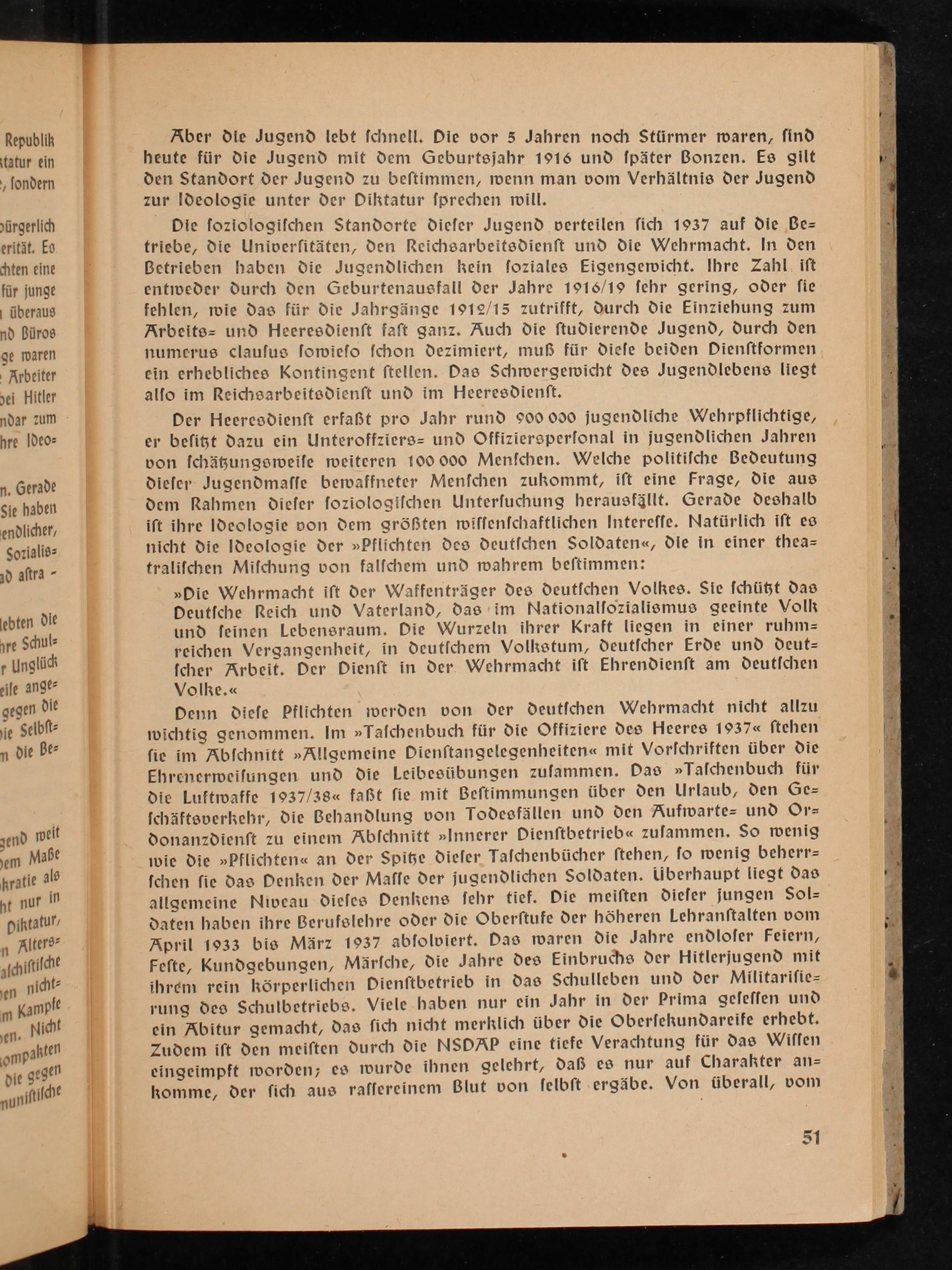 Der Heercsdienſt erfaßt pro Jahr rund 900 000 jugendliche Wehrpflichtige, ey beſizt dazu ein Unteroffziers= und Offiziersperſonal in jugendlichen Jahren von ſchäßzungsweiſe weiteren 100000 Menſchen. Welche politiſche Bedeutung dieſer Jugendmaſſe bewaffneter Menſchen zukommt, iſt eine Frage, die aus dem Rahmen dieſer ſoziologiſchen Unterſuchung herausfällt. Gerade deshalb iſt ihre Ideologie von dem größten wiſſenſchaftlichen Intereſſe. Natürlich iſt es nicht die Ideologie der»Pflichten des deutſchen Soldaten«, die in einer theaz traliſchen Miſchung von falſchem und wahrem beſtimmen: