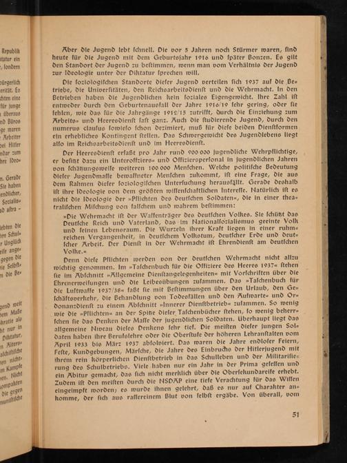 Denn dieſe Pflichten werden von der deutſchen Wehrmacht nicht allzu wichtig genommen. Im»Taſchenbuch für die Offiziere des Heeres 1937« ſtehen ſie im Abſchnitt»Allgemeine Dienſtangelegenheiten« mit Vorſchriften über die Ehrecnerweiſungen und die Leibesübungen zuſammen. Pas»Taſchenbuch für die Luftwaffe 1937/38« faßt ſie mit Beſtimmungen über den Urlaub, den Ge= ſchäftsverkehr, die Behandlung von Todesfällen und den Aufwarte= und Or= donanzdienſt zu einem Abſchnitt»Innerer Dienſtbetrieb« zuſammen. So wenig wie die»Pflichten« an der Spitze dieſer Taſchenbücher ſtehen, ſo wenig beherr= ſchen ſie das Denken der Maſſe der jugendlichen Soldaten. überhaupt liegt das allgemeine Niveau dieſes Denkens ſehr tief. Die meiſten dieſer jungen Sol= daten haben ihre Berufslehre oder die Oberſtufe der höheren Lehranſtalten vom April 1933 bis März 1937 abſolviert. Das maren die Jahre endloſer Feiern, Feſte, Kundgebungen, Märſche, die Jahre des Einbruchs der Hitlerjugend mit ihrém rein körperlichen Dienſtbetrieb in das Schulleben und der Militariſie= rung des Schulbetriebs. Viele haben nur ein Jahr in der Prima geſeſſen und ein Abitur gemacht, das ſich nicht merklich über die Oberſekundareife erhebt. Zudem iſt den meiſten durch die NSOAP eine tiefe Verachtung für das Wiſſen eingeimpft worden; es wurde ihnen gelehrt, daß es nur auf Charakter an= komme, der ſich aus raſſereinem Blut von ſelbſt ergäbe. Von überall, vom