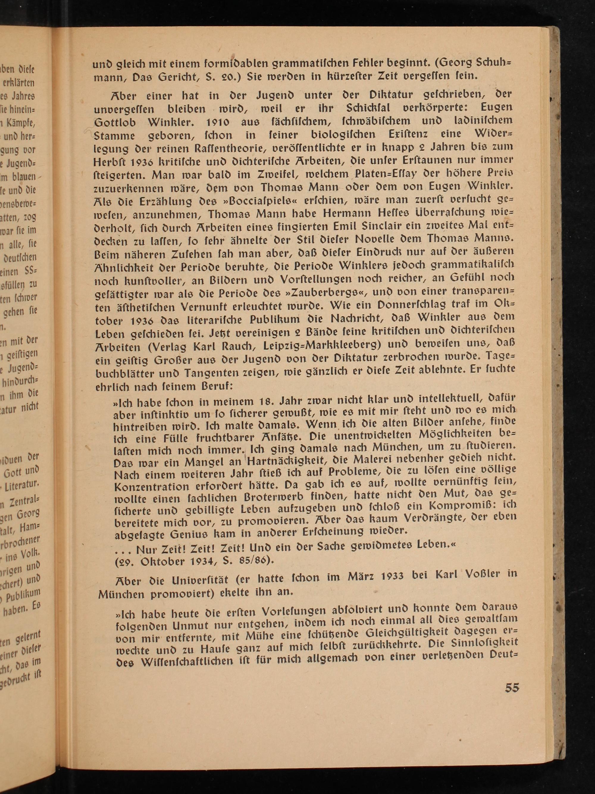 es Jahres Aber einer hat in der Jugend unter der Oiktatur geſchrieben, der ie hinein- unvergeſſen bleiben- wird, weil er ihr Schickſal verkörperte: Eugen 1 Kämpfe, Gottlob Winkler. 1910 aus ſächſiſchem, ſchwäbiſchem und ladiniſchem und her- Stamme geboren, ſchon in ſeiner biologiſchen Exiſtenz eine Wider= gung vor legung der reinen Raſſentheorie, veröſſentlichte er in knapp 2 Jahren bis zum e Jugend- Herbſt 1936 kritiſche und dichteriſche Arbeiten, die unſer Erſtaunen nur immer m blauen-" ſteigerten. Man war bald im Zweifel, welchem Platen-Eſſay der höhere Preis [e und die zuzuerkennen wäre, dem von Thomas Mann oder dem von Eugen Winkler. ensbervez Als die Erzählung des»Bocciaſpiels« erſchien, wäre man zuerſt verſucht ge= 1ften, 209 weſen, anzunehmen, Thomas Mann habe Hermann Heſſes überraſchung mie= var ſie im FF derholt, ſich durch Arbeiten eines fingierten Emil Sinclair ein zweites Mal ent= 1 alle, ſie decken zu laſſen, ſo ſehr ähnelte der Stil dieſer Novelle dem Thomas Manns . deutſchen Beim näheren Zuſehen ſah man aber, daß dieſer Eindruck nur auf der äußeren ¿inen$S- Ahnlichkeit der Periode beruhte, die Periode Winklers jedoch grammatikaliſch sfüllen zu noch kunſtvoller, an Bildern und Vorſtellungen noch reicher, an Gefühl noch ten ſchier geſättigter war als die Periode des»Zauberbergs«, und von einer transparen= gehen ſie ten äſthetiſchen Vernunft erleuchtet wurde. Wie ein Donnerſchlag traf im Olz= tober 1936 das literariſche Publikum die Nachricht, daß Winkler aus dem Leben geſchieden ſei. Jett vereinigen 2 Bände ſeine kritiſchen und dichteriſchen Arbeiten(Verlag Karl Rauch, Leipzig=Markkleeberg ) und beweiſen uns, daß ein geiſtig Großer aus der Jugend von der OPiktatur zerbrochen wurde. Tage= buchblätter und Tangenten zeigen, wie gänzlich er dieſe Zeit ablehnte. Er ſuchte ehrlich nach ſeinem Beruf: »Ich habe ſchon in meinem 18. Jahr zwar nicht klar und intellektuell, dafür aber inſtinktiv um ſo ſicherer gewußt, wie es mit mir ſteht und wo es mich hintreiben wird. Ich malte damals. Wenn. ich die alten Bilder anſehe, finde ich eine Fülle fruchtbarer Anſätze. Die unentwickelten Möglichkeiten be= ¡duen der laſten mich noch immer. Ich ging damals nach München , um zu ſtudieren. ias nd Das war ein Mangel an‘Hartnäckigkeit, die Malerei nebenher gedieh nicht. Gott V| Nach einem weiteren Jahr ſtieß ich auf Probleme, die zu löſen eine völlige Literatur À Konzentration erfordert hätte. Da gab ich es auf, wollte vernünftig ſein, n Zentral-| wollte einen ſachlichen Broterwerb finden, hatte nicht den Mut, das ge= zen Georg ſicherte und gebilligte Leben aufzugeben und ſchloß ein Kompromiß: ich alt, Ham- bereitete mich vor, zu promovieren. Aber das kaum Verdrängte, der eben rbrochene" abgeſagte Genius kam in anderer Erſcheinung wieder. , ins Volk, …. Nur Zeit! Zeit! Zeit! Und ein der Sache gewidmetes Leben.« „igen und(29. Oktober 1934, S. 85/86).