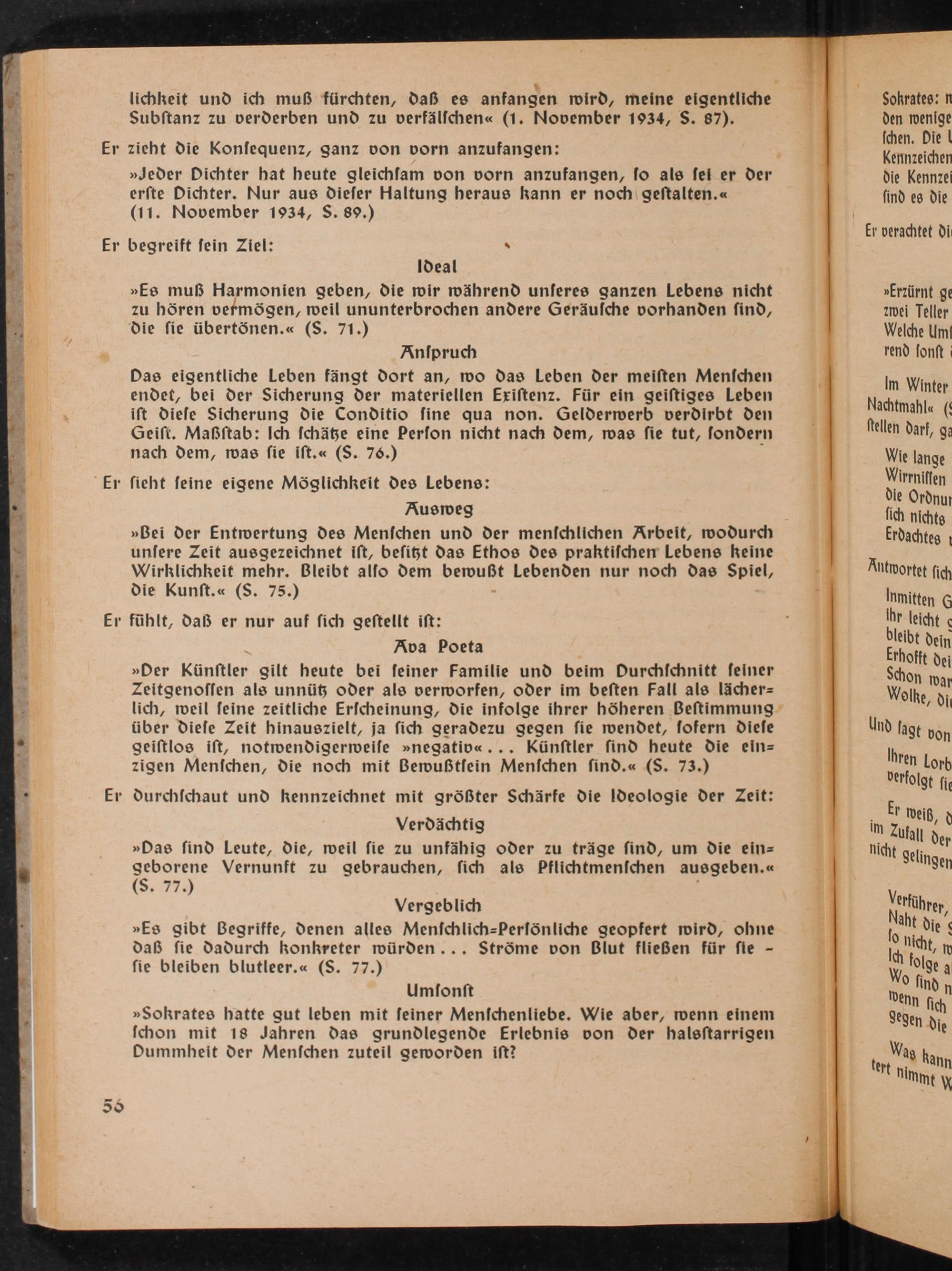 »Bei der Entwertung des Menſchen und der menſchlichen Arbeit, wodurch unſere Zeit ausgezeichnet iſt, beſitzt das Ethos des praktiſcher Lebens keine Wirklichkeit mehr. Bleibt alſo dem bewußt Lebenden nur noch das Spiel, die kKunſt.«(S. 75.)- s