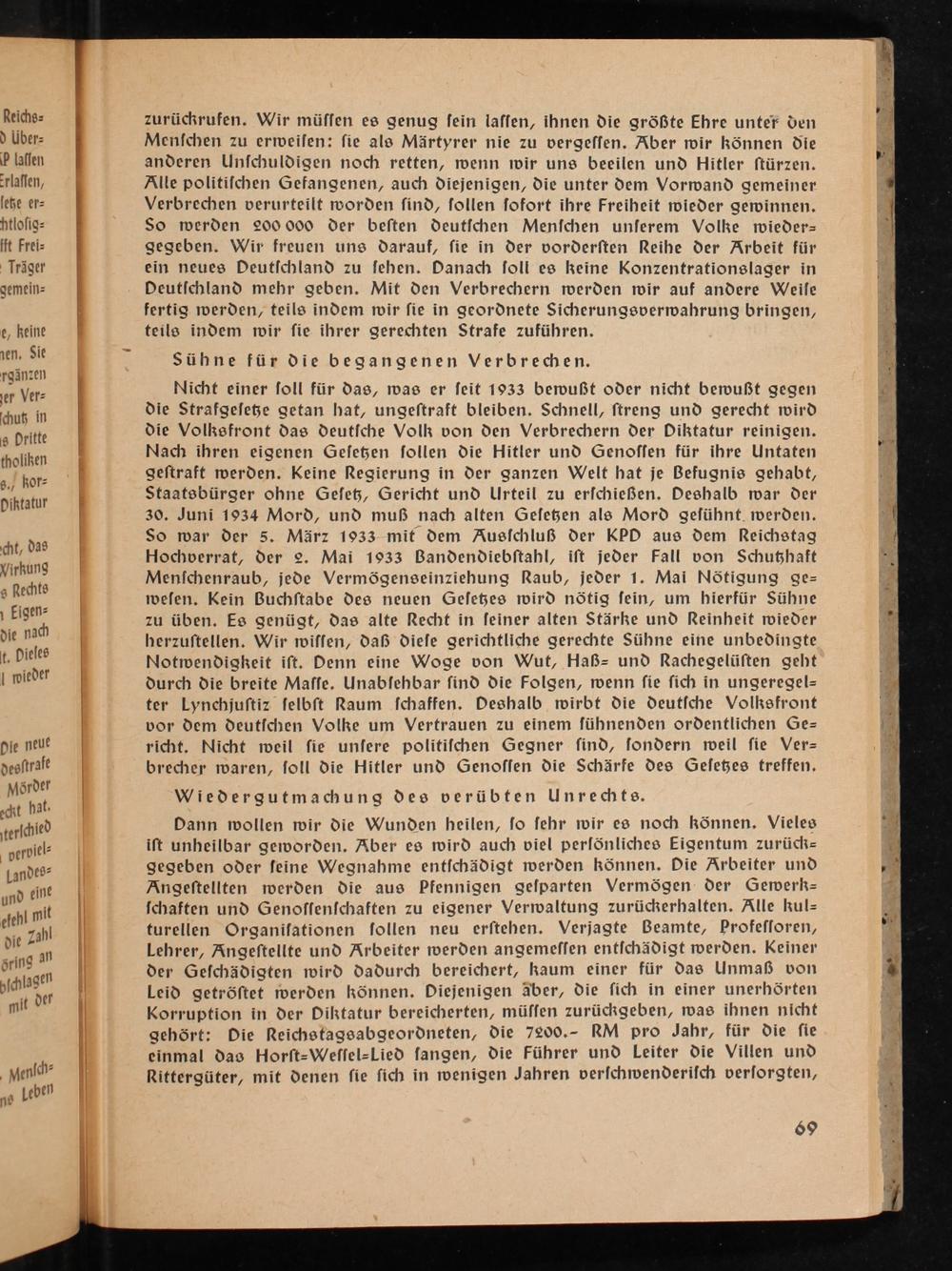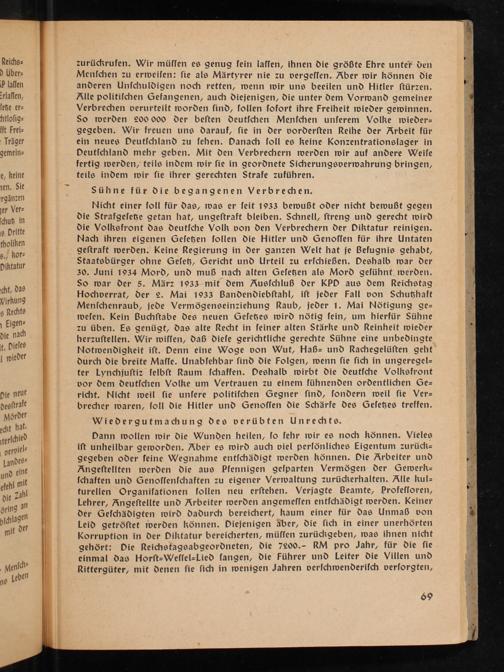 Dann wollen wir die Wunden heilen, ſo ſehr wir es noch können. Vieles iſt unheilbar geworden. Aber es wird auch viel perſönliches Eigentum zurüchk=- gegeben oder ſeine Wegnahme entſchädigt werden können. Die Arbeiter und Angeſtellten werden die aus Pfennigen geſparten Vermögen- der Gewerk= ſchaften und Genoſſenſchaften zu eigener Verwaltung zurückerhalten. Alle kul= turellen Organiſationen ſollen neu erſtehen. Verjagte Beamte, Profeſſoren, Lehrer, Angeſtellte und Arbeiter werden angemeſſen entſchädigt werden. Keiner der Geſchädigten wird dadurch bereichert, kaum einer für das Unmaß von Leid getröſtet werden können. Diejenigen äber, die ſich in einer unerhörten Korruption in der Diktatur bereicherten, müſſen zurückgeben, was ihnen nicht gehört: Die Reichstagsabgeordneten, die 7200.- RM pro Jahr, für die ſie cinmal das Horſt=Weſſel-Lied ſangen, die Führer und Leiter die Villen und Rittergüter, mit denen ſie ſich in wenigen Jahren verſchwenderiſch verſorgten,
