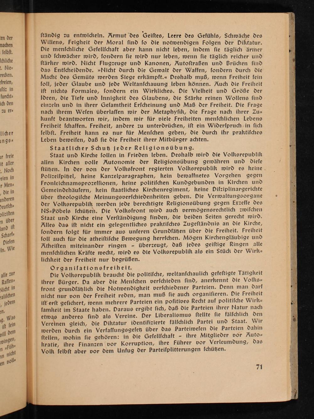Staat und Kirche ſollen in Frieden leben. Deshalb wird die Volksrepublilz allen Kirchen volle Autonomie der Religionsübung gewähren und dieſe