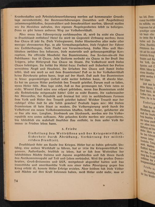 Aber wenn das Führerprinzip verſchwunden iſt, wird da nicht ein Chaos in Deutſchland entſtehen? Nein! Es wird im Gegenteil Ordnung werden; denn das Chaos iſt jetzt da. Dieſe Vielregiererei, dieſes Hineinreden aller mehr oder wenigei ehrenwerten Pgs. in alle Verwaltungsſachen, dieſe Feigheit der Führer vor Entſcheidungen, dieſe Flucht vor Verantwortung, dieſes Hin-= und Her= ſchieben zwiſchen den Inſtanzen, dieſe materielle und geſinnungsmäßige Kor= ruption, die offizielle Meuchelei des Beamtentums, das So=tun=als=0b des Publikums: das iſt Chaos. Jede Uniform verdeckt ein Chaos in der Bruſt des Trägers, jeder Hitlergruß das Chaos im Staate. Die Volksfront wird dieſes Chaos beſeitigen. Sie beſitzt die Mittel dazu: Freiheit und Sicherheit der Perſon vernichten Angſt und Heuchelei, die Urſachen des Chaos und damit dieſes ſelbſc. Und wie wird es mit dem Beamtentum? Daß es in der Volksherrſchaft keine Bürokratie geben kann, liegt auf der Hand. Daß auch das Beamtentum in ſeiner gegenwärtigen Geſtalt nicht weiter beſtehen kann, iſt ebenſo klar. Es hat im ganzen Hitler perſönlich den Treueid geleiſtet. Darum muß es fallen, wenn Hitler fällt. Man ſage nicht, daß es das gezwungen tat. Viele taten es nicht. Wieviel Elend wäre uns erſpart geblieben, wenn das Beamtentum nicht alle Rechtsbrüche mitgemacht hätte! Gibt es nicht Beamte, die nacheinander der Monarchie, der Republik und dreimal ſeit 1933 in verſchiedenen Formen dem Volk und Hitler den Treueid geleiſtet haben? Welcher Treueid war der richtige? Oder ſind ſie alle falſch geweſen? Peshalb ſagen wir: Mit dieſem Beamtentum iſt kein Staat zu machen. Die Volksregierung wird durch die Volksfront ein neues Volksbeamtentum ſchaffen, beſſer, freier, geſicherter als ee das alte war. Langſam, Stockwerk um Stockwerk, werden wir die Volks= republik von unten aufbauen. Alle geſunden Kräfte werden wir organiſieren, bis ſchließlich ein wahrhaft deutſcher Bau entſteht, in dem unſer Volk für immer in Frieden leben kann.