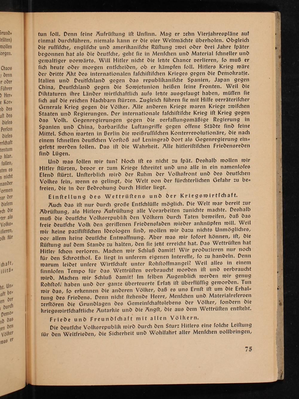 Und was ſollen wir tun? Noch iſt es nicht zu ſpät. Deshalb wollen wir Hitler ſtürzen, bevor er zum Kriege ſchreitet und uns alle in ein namenloſes Elend ſtürzt. Unſterblich wird der Ruhm der Volksfront und des deutſchen Volkes ſein, wenn es gelingt, die Welt von der fürchterlichen Gefahr zu be= freien, die in der Bedrohung durch Hitler liegt.