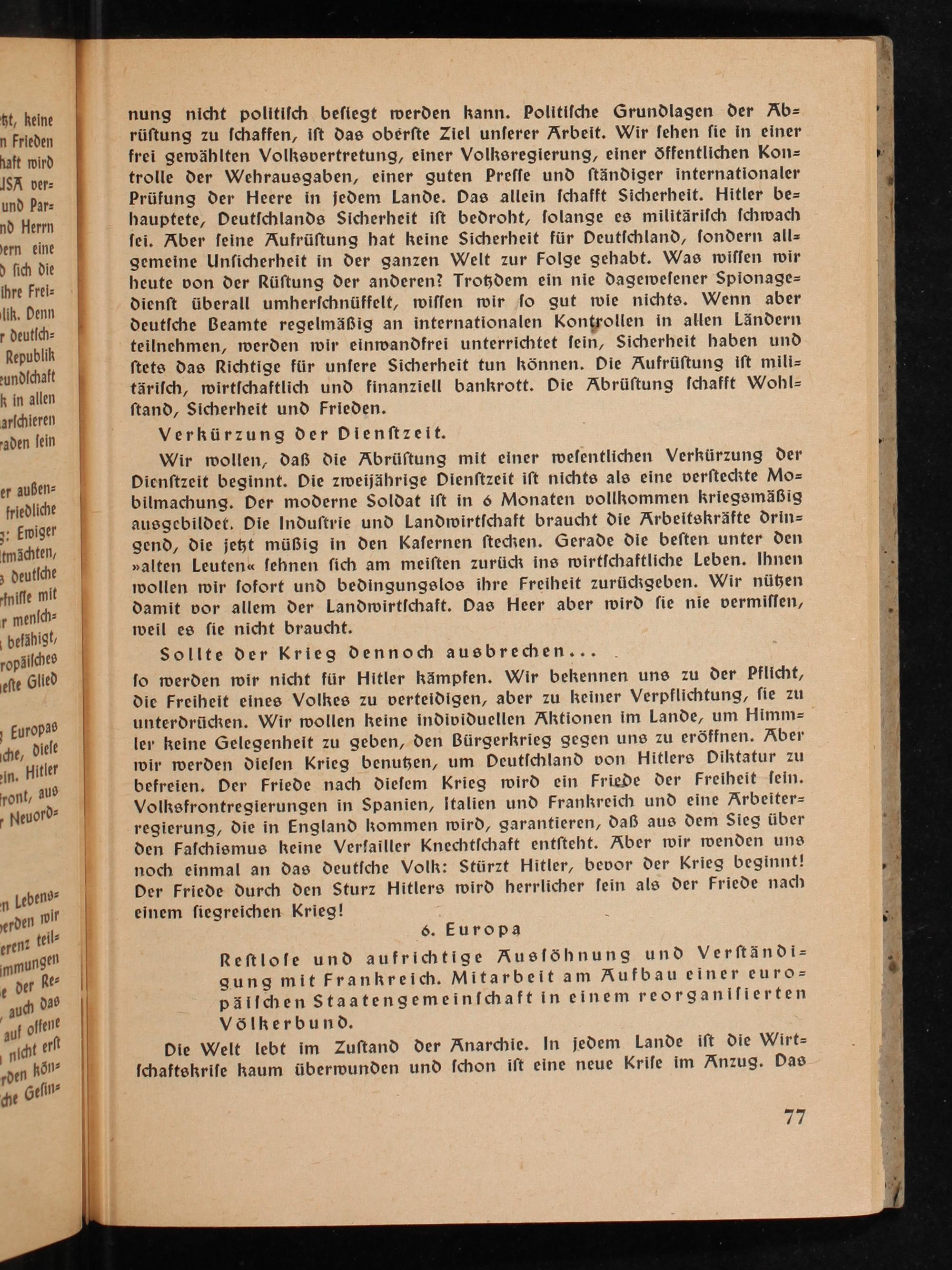 Sollte der Krieg dennoch ausbrechen... ſo werden wir nicht für Hitler kämpfen. Wir bekennen uns zu der Pflicht, die Freiheit eines Volkes zu verteidigen, aber zu keiner Verpflichtung, ſie zu unterdrücken. Wir wollen keine individuellen Aktionen im Lande, um Himms= ler keine Gelegenheit zu geben, den Bürgerkrieg gegen uns zu eröffnen. Aber wir werden dieſen Krieg benußzen, um Deutſchland von Hitlers Diktatur zu befreien. Der Friede nach dieſem Krieg wird ein Friede der Freiheit ſein. Volksfrontregierungen in Spanien, Italien und Frankreich und eine Arbeiter= regierung, die in England kommen wird, garantieren, daß aus dem Sieg über den Faſchismus keine Verfailler Knechtſchaft entſteht. Aber wir wenden uns noch ecinmal an das deutſche Volk: Stürzt Hitler , bevor der krieg beginnt! Der Friede durch den Sturz Hitlers wird herrlicher ſein als der Friede nach einem ſiegreichen Krieg!
