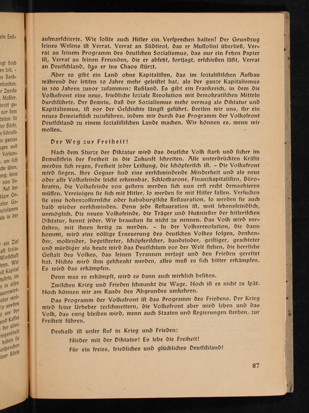 Nach dem Sturze der Diktatur wird das deutſche Volk ſtark und ſicher im Bewußtſein der Freiheit in die Zukunft ſchreiten. Alle unterdrückten Kräfte werden ſich regen, Freiheit jeder Leiſtung, die ſchöpferiſch iſt.- Die Volksfront wird ſiegen. lhre Gegner ſind eine verſchwindende Minderheit und als neue oder alte Volksfeinde leicht erkennbar, Schlotbarone, Finanzkapitaliſten, Büro= kraten, die Volksfeinde von geſtern werden ſich nun erſt recht demaskieren müſſen. Verecinigen ſie ſich mit Hitler, ſo werden ſie mit Hitler fallen. Verſuchen ſie cine hohenzollernſche oder habsburgiſche Reſtauration, ſo werden ſie auch bald wieder verſchwinden. Denn jede Reſtauration iſt, weil lebensfeindlich, unmöglich. Die neuen Volksfeinde, die Träger und Nutznießer der hitleriſchen Diktatur, kennt jeder. Wir brauchen ſie nicht zu nennen. Das Volk wird ver= ſtehen, mit ihnen fertig zu werden.- In der Volksrevolution, die dann kommt, wird eine völlige Erneuerung des deutſchen Volkes folgen, denken= der, wollender, begeiſterter, ſchöpferiſcher, handelnder, geiſtiger, geachteter und würdiger als heute ivird das Deutſchtum vor der Welt ſtehen, die herrliche Geſtalt des Volkes, das ſeinen Tyrannen verjagt und den Frieden gerettet hat. Nichts wird ihm geſchenkt werden, alles muß es ſich bitter erkämpfen. Es mird das erkämpfen.