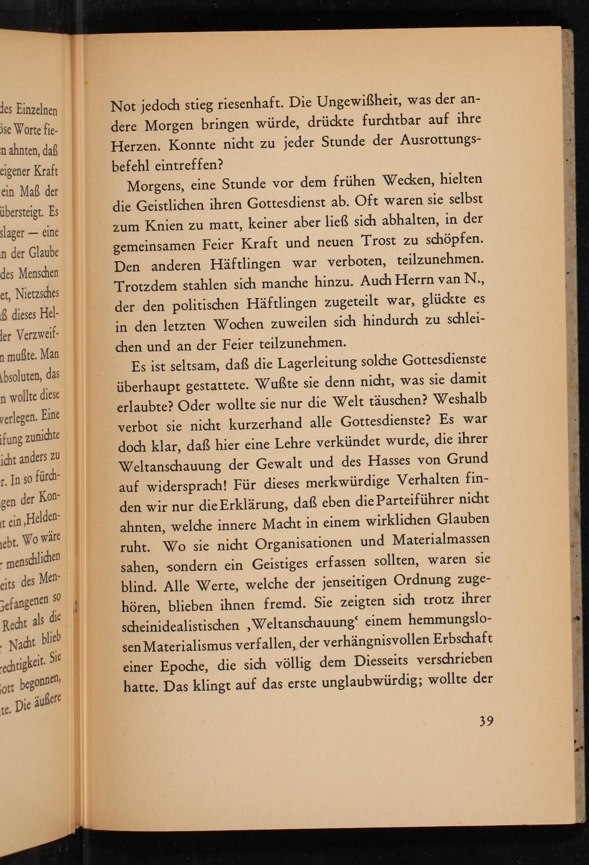 Es ist seltsam, daß die Lagerleitung solche Gottesdienste überhaupt gestattete. Wußte sie denn nicht, was sie damit erlaubte? Oder wollte sie nur die Welt täuschen? Weshalb verbot sie nicht kurzerhand alle Gottesdienste? Es war doch klar, daß hier eine Lehre verkündet wurde, die ihrer Weltanschauung der Gewalt und des Hasses von Grund auf widersprach! Für dieses merkwürdige Verhalten finden wir nur die Erklärung, daß eben die Parteiführer nicht ahnten, welche innere Macht in einem wirklichen Glauben ruht. Wo sie nicht Organisationen und Materialmassen sahen, sondern ein Geistiges erfassen sollten, waren sie blind. Alle Werte, welche der jenseitigen Ordnung zugehören, blieben ihnen fremd. Sie zeigten sich trotz ihrer scheinidealistischen, Weltanschauung' einem hemmungslosen Materialismus verfallen, der verhängnisvollen Erbschaft einer Epoche, die sich völlig dem Diesseits verschrieben hatte. Das klingt auf das erste unglaubwürdig; wollte der