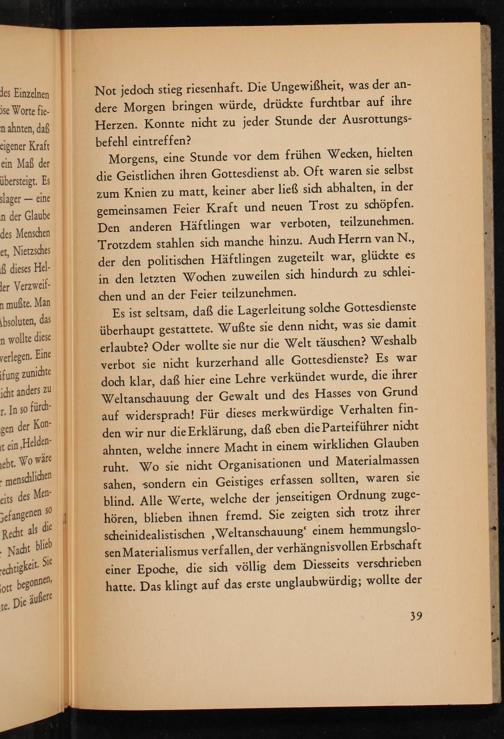 Morgens, eine Stunde vor dem frühen Wecken, hielten die Geistlichen ihren Gottesdienst ab. Oft waren sie selbst zum Knien zu matt, keiner aber ließ sich abhalten, in der gemeinsamen Feier Kraft und neuen Trost zu schöpfen. Den anderen Häftlingen war verboten, teilzunehmen. Trotzdem stahlen sich manche hinzu. Auch Herrn van N., der den politischen Häftlingen zugeteilt war, glückte es in den letzten Wochen zuweilen sich hindurch zu schleichen und an der Feier teilzunehmen.