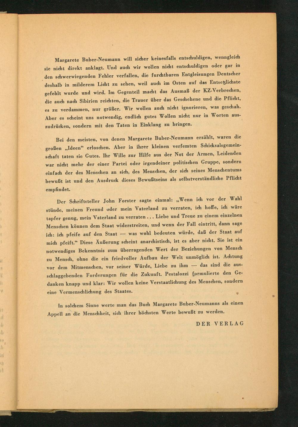 Bei den meisten, von denen Margarete Buber-Neumann erzählt, waren die großen„Ideen“ erloschen. Aber in ihrer kleinen verfemten Schicksalsgemein- schaft taten sie Gutes. Ihr Wille zur Hilfe aus der Not der Armen, Leidenden war nicht mehr der einer Partei oder irgendeiner politischen Gruppe, sondern einfach der des Menschen an sich, des Menschen, der sich seines Menschentums bewußt ist und den Ausdruck dieses Bewußtseins als selbstverständliche Pflicht