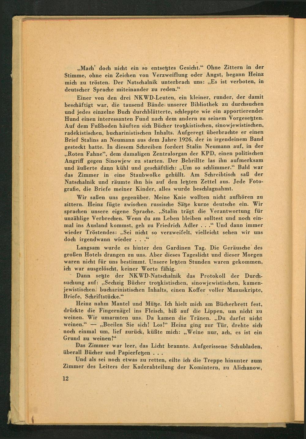Einer von den drei NKWD - Leuten, ein kleiner, runder, der damit beschäftigt war, die tausend Bände unserer Bibliothek zu durchsuchen und jedes einzelne Buch durchblätterte, schleppte wie ein apportierender Hund einen interessanten Fund nach dem andern zu seinem Vorgesetzten. Auf dem Fußboden häuften sich Bücher trotzkistischen, sino wjewistischen, radekistischen, bucharinistischen Inhalts. Aufgeregt überbrachte er einen Brief Stalins an Neumann aus dem Jahre 1926, der in irgendeinem Band gesteckt hatte. In diesem Schreiben fordert Stalin Neumann auf, in der ,, Roten Fahne", dem damaligen Zentralorgan der KPD , einen politischen Angriff gegen Sinowjew zu starten. Der Bebrillte las ihn aufmerksam und äußerte dann kühl und geschäftlich: Um so schlimmer." Bald war das Zimmer in eine Staubwolke gehüllt. Am Schreibtisch saß der Natschalnik und räumte ihn bis auf den letzten Zettel aus. Jede Foto­grafie, die Briefe meiner Kinder, alles wurde beschlagnahmt.