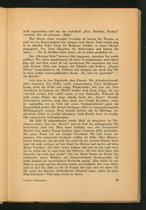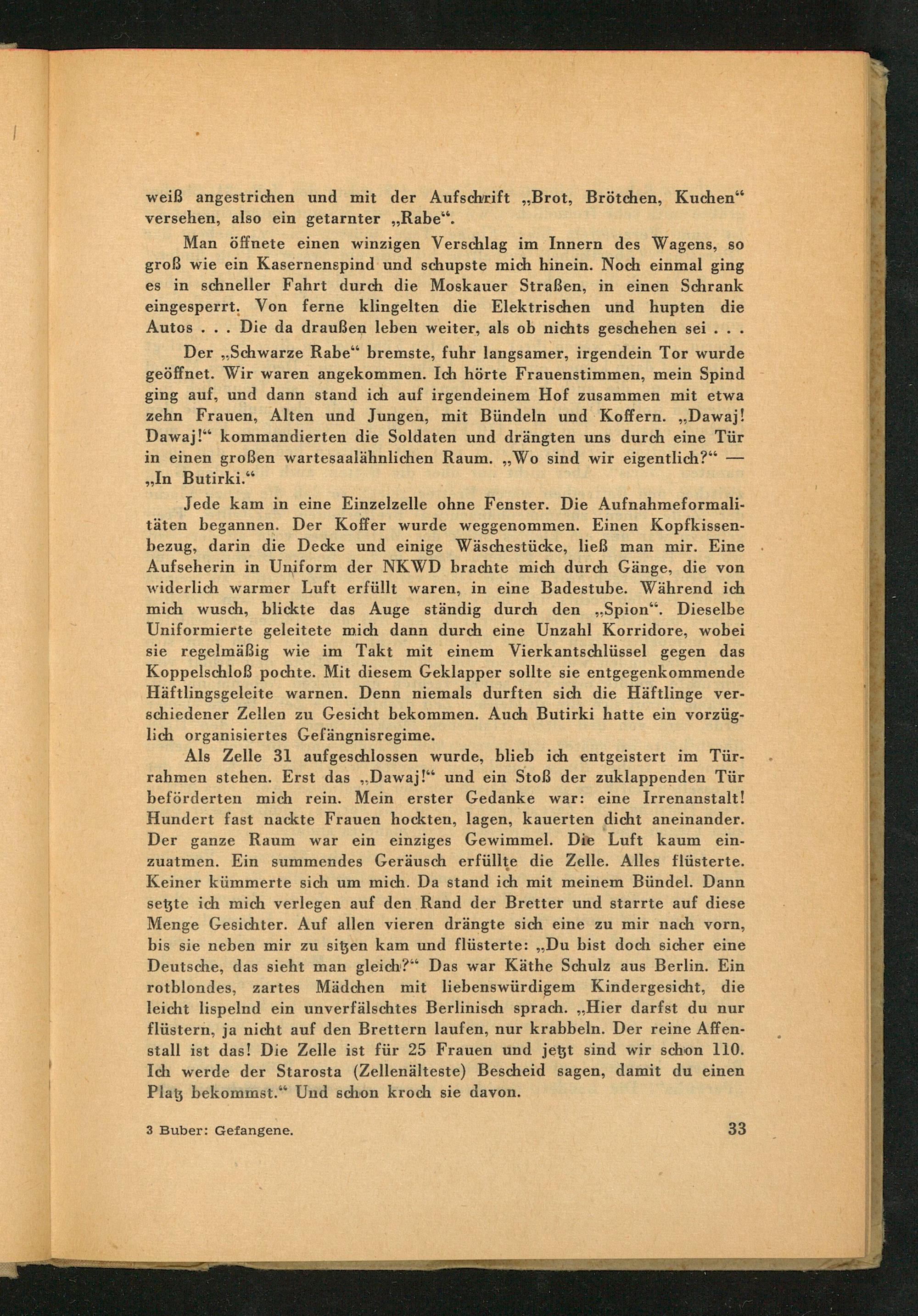 Der ,, Schwarze Rabe" bremste, fuhr langsamer, irgendein Tor wurde geöffnet. Wir waren angekommen. Ich hörte Frauenstimmen, mein Spind ging auf, und dann stand ich auf irgendeinem Hof zusammen mit etwa zehn Frauen, Alten und Jungen, mit Bündeln und Koffern.„ Dawaj! Dawaj!" kommandierten die Soldaten und drängten uns durch eine Tür in einen großen wartesaalähnlichen Raum. ,, Wo sind wir eigentlich?" Butirki."