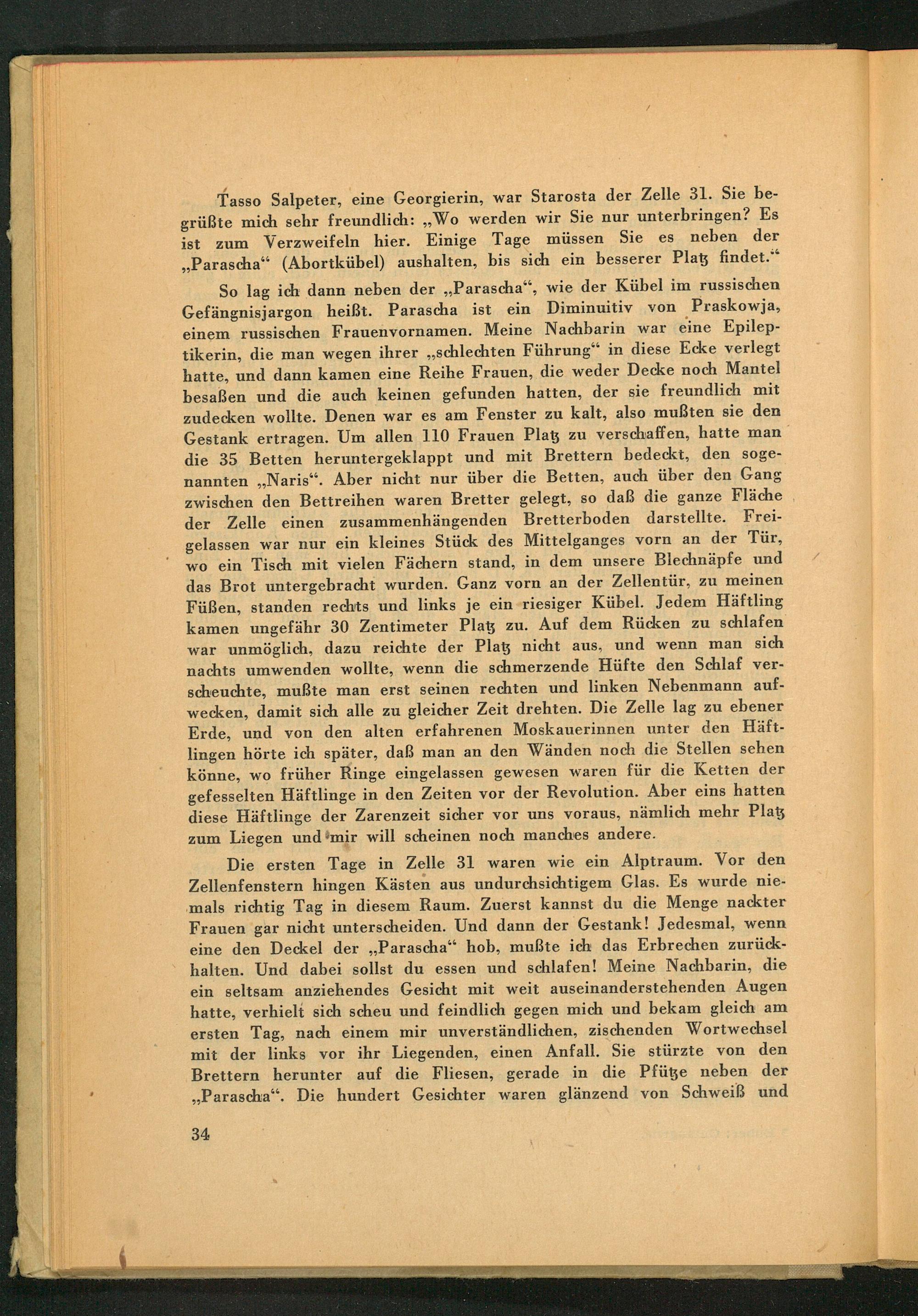 Tasso Salpeter, eine Georgierin, war Starosta der Zelle 31. Sie begrüßte mich sehr freundlich: ,, Wo werden wir Sie nur unterbringen? Es ist zum Verzweifeln hier. Einige Tage müssen Sie es neben der ,, Parascha"( Abortkübel) aushalten, bis sich ein besserer Platz findet."