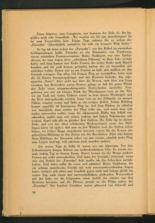 Die ersten Tage in Zelle 31 waren wie ein Alptraum. Vor den Zellenfenstern hingen Kästen aus undurchsichtigem Glas. Es wurde niemals richtig Tag in diesem Raum. Zuerst kannst du die Menge nackter Frauen gar nicht unterscheiden. Und dann der Gestank! Jedesmal, wenn eine den Deckel der ,, Parascha" hob, mußte ich das Erbrechen zurückhalten. Und dabei sollst du essen und schlafen! Meine Nachbarin, die ein seltsam anziehendes Gesicht mit weit auseinanderstehenden Augen hatte, verhielt sich scheu und feindlich gegen mich und bekam gleich am ersten Tag, nach einem mir unverständlichen, zischenden Wortwechsel mit der links vor ihr Liegenden, einen Anfall. Sie stürzte von den Brettern herunter auf die Fliesen, gerade in die Pfütze neben der ,, Parascha". Die hundert Gesichter waren glänzend von Schweiß und