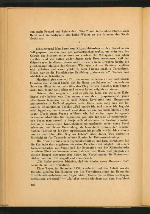 Drinnen aber sangen wir, und es gab ein Lied, das bei allen Häftlingen sehr beliebt war. Das stammte von den„, Bjesprisornijs", jenen elternlosen Kindern, die es nach Krieg, Revolution und Hungersnot massenweise in Rußland gegeben hatte. Einen Vers sang man mit besonders schmerzlichem Gefühl: ,, Und sterbe ich, und sterbe ich, begrabt mich irgendwo, und niemand wird dann wissen, wo mein kleines Grab liegt." Durch einen Zugang erfuhren wir, daß es im Lager Karaganda besondere Abschnitte für Jugendliche gab, also für jene Bjesprisornijs", von denen man sowohl in Sowjetrußland als auch im Ausland annahm, daß sie in vorzüglichen Kinderheimen untergebracht seien, einen Beruf erlernten, und deren Umschulung als besonderer Beweis der erzieherischen Tüchtigkeit der Sowjetpädagogen hingestellt wurde. Ich erinnere nur an den Film„ Der Weg ins Leben". Aber dieser Weg endete in Wirklichkeit für Tausende solcher Kinder im Konzentrationslager.