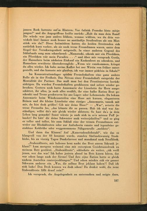 Im Konzentrationslager spielen Freundschaften eine ganz andere Rolle als in der Freiheit. Das Niveau einer Freundschaft entspricht der Mentalität der Partner. Das muß man bei den Prostituierten berücksichtigen. Da wurden Freundschaften geschlossen und sofort wieder gebrochen. Gestern noch hatte Annemarie der Lieselotte ihr Herz ausgeschüttet, ihr alles, ja auch alles erzählt, ihr eine halbe Ration Brot geschenkt und Treue geschworen bis ans Lager- oder Lebensende. Da bekam Annemarie beim Wäscheausteilen eine Hose mit kurzen, eleganteren Beinen und die kleine Lieselotte eine riesige: ,, Annemarie, tausch mit mir, du bist doch größer! Gib mir deine Hose!", Was", zeterte die treue Freundin los ,,, das könnte dir so passen. Hab ich mal was Anständiges, willst du's mir gleich wieder ablotsen. So hast du's ja dein Leben lang gemacht! Sonst wärste ja auch nich in so'n miesen Puff jelandet! Da hätt' dir deine Schwester auch weiterjeholfen!" und so ging es toller und toller, bis zum Schluß eine der treuen Freundinnen entweder zur Block ältesten oder zur Aufseherin rannte und irgendeine gestohlene Kohlrübe oder weggenommene Nähgarnrolle ,, meldete".