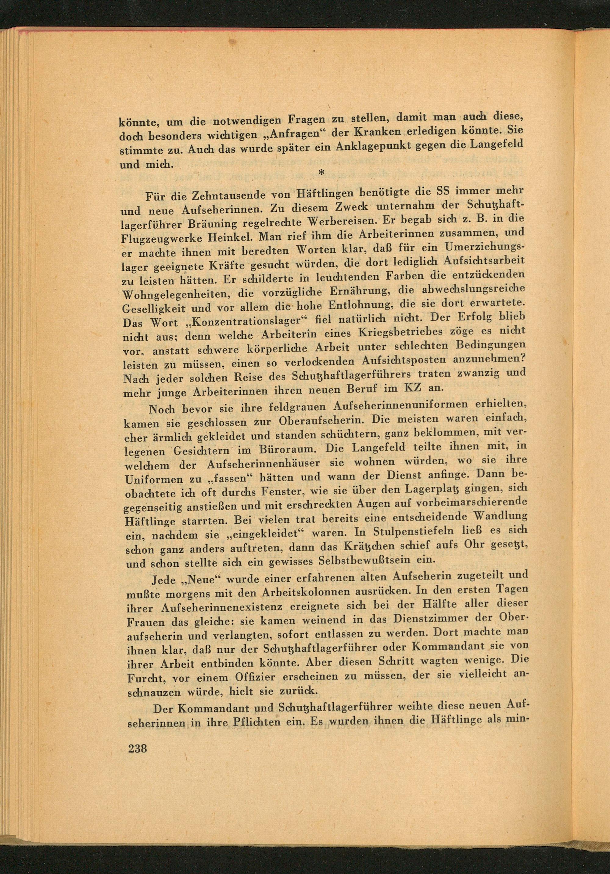 Noch bevor sie ihre feldgrauen Aufseherinnenuniformen erhielten, kamen sie geschlossen zur Oberaufseherin. Die meisten waren einfach, eher ärmlich gekleidet und standen schüchtern, ganz beklommen, mit verlegenen Gesichtern im Büroraum. Die Langefeld teilte ihnen mit, in welchem der Aufseherinnenhäuser sie wohnen würden, wo sie ihre Uniformen zu ,, fassen" hätten und wann der Dienst anfinge. Dann beobachtete ich oft durchs Fenster, wie sie über den Lagerplatz gingen, sich gegenseitig anstießen und mit erschreckten Augen auf vorbeimarschierende Häftlinge starrten. Bei vielen trat bereits eine entscheidende Wandlung ein, nachdem sie ,, eingekleidet" waren. In Stulpenstiefeln ließ es sich schon ganz anders auftreten, dann das Krätzchen schief aufs Ohr gesetzt, und schon stellte sich ein gewisses Selbstbewußtsein ein.