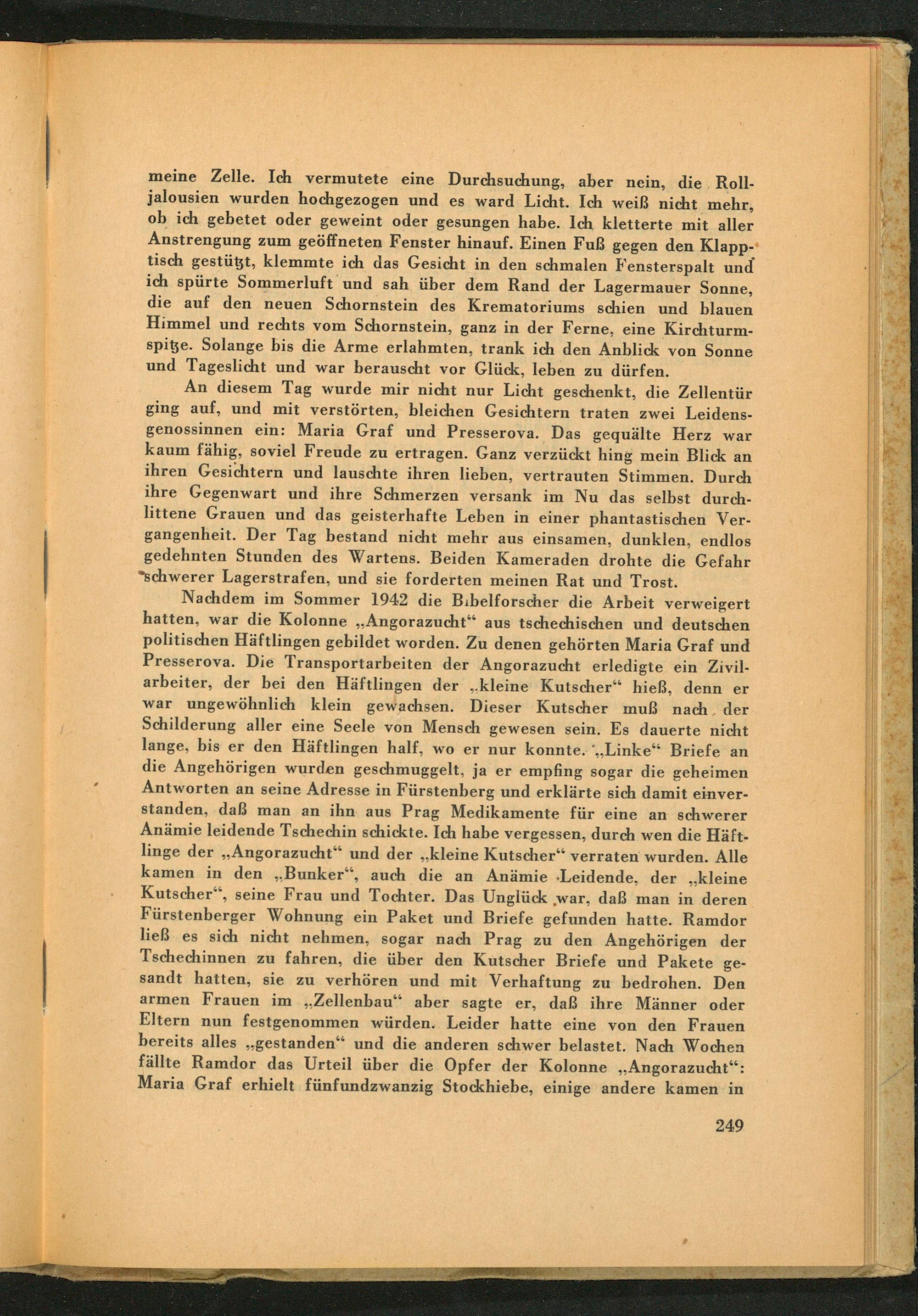 An diesem Tag wurde mir nicht nur Licht geschenkt, die Zellentür ging auf, und mit verstörten, bleichen Gesichtern traten zwei Leidensgenossinnen ein: Maria Graf und Presserova. Das gequälte Herz war kaum fähig, soviel Freude zu ertragen. Ganz verzückt hing mein Blick an ihren Gesichtern und lauschte ihren lieben, vertrauten Stimmen. Durch ihre Gegenwart und ihre Schmerzen versank im Nu das selbst durchlittene Grauen und das geisterhafte Leben in einer phantastischen Vergangenheit. Der Tag bestand nicht mehr aus einsamen, dunklen, endlos gedehnten Stunden des Wartens. Beiden Kameraden drohte die Gefahr schwerer Lagerstrafen, und sie forderten meinen Rat und Trost.