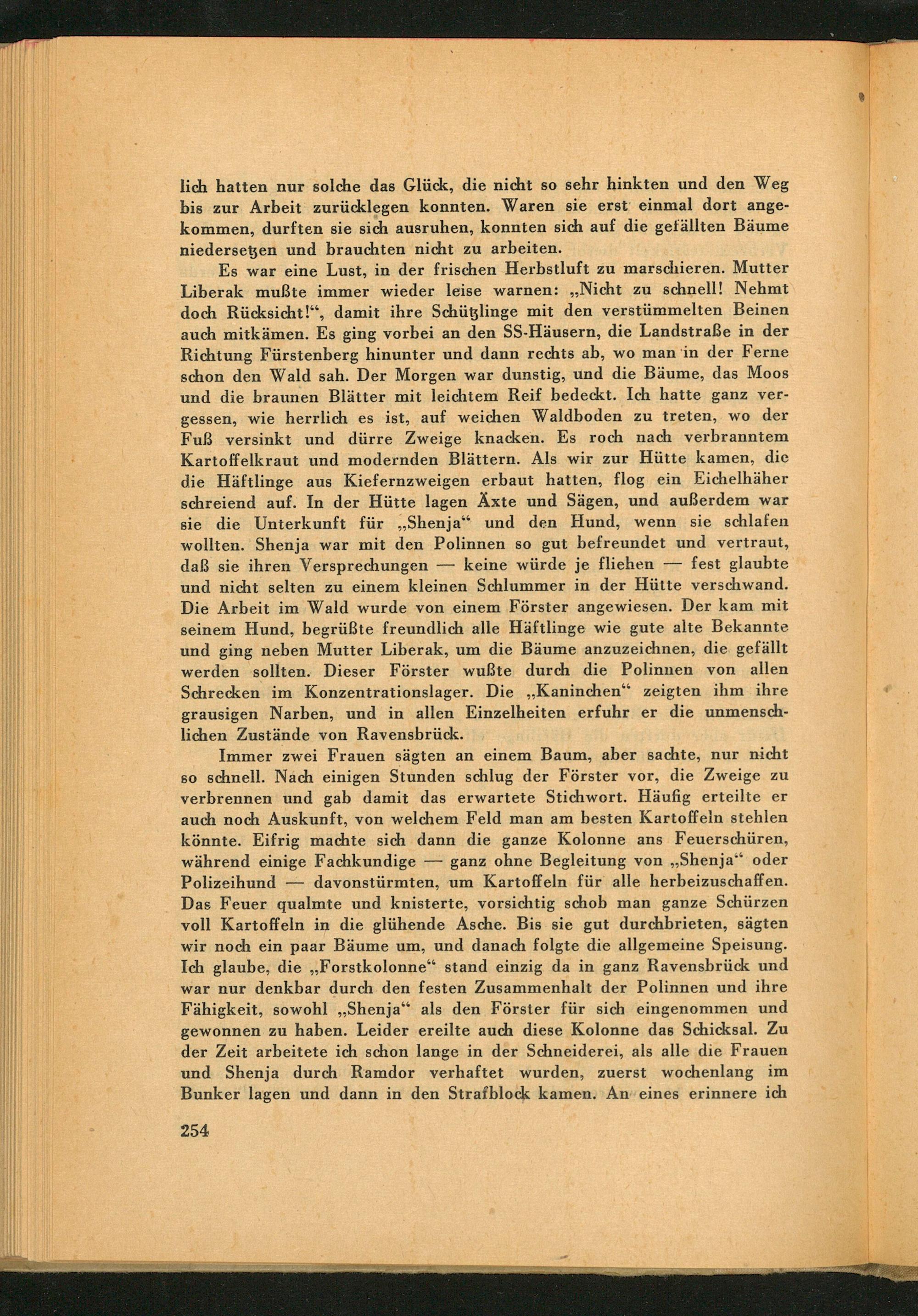 Es war eine Lust, in der frischen Herbstluft zu marschieren. Mutter Liberak muẞte immer wieder leise warnen: ,, Nicht zu schnell! Nehmt doch Rücksicht!", damit ihre Schützlinge mit den verstümmelten Beinen auch mitkämen. Es ging vorbei an den SS - Häusern, die Landstraße in der Richtung Fürstenberg hinunter und dann rechts ab, wo man in der Ferne schon den Wald sah. Der Morgen war dunstig, und die Bäume, das Moos und die braunen Blätter mit leichtem Reif bedeckt. Ich hatte ganz vergessen, wie herrlich es ist, auf weichen Waldboden zu treten, wo der Fuß versinkt und dürre Zweige knacken. Es roch nach verbranntem Kartoffelkraut und modernden Blättern. Als wir zur Hütte kamen, die die Häftlinge aus Kiefernzweigen erbaut hatten, flog ein Eichelhäher schreiend auf. In der Hütte lagen Äxte und Sägen, und außerdem war sie die Unterkunft für ,, Shenja" und den Hund, wenn sie schlafen wollten. Shenja war mit den Polinnen so gut befreundet und vertraut, daß sie ihren Versprechungen keine würde je fliehen- fest glaubte und nicht selten zu einem kleinen Schlummer in der Hütte verschwand. Die Arbeit im Wald wurde von einem Förster angewiesen. Der kam mit seinem Hund, begrüßte freundlich alle Häftlinge wie gute alte Bekannte und ging neben Mutter Liberak, um die Bäume anzuzeichnen, die gefällt werden sollten. Dieser Förster wußte durch die Polinnen von allen Schrecken im Konzentrationslager. Die„ Kaninchen" zeigten ihm ihre grausigen Narben, und in allen Einzelheiten erfuhr er die unmenschlichen Zustände von Ravensbrück .