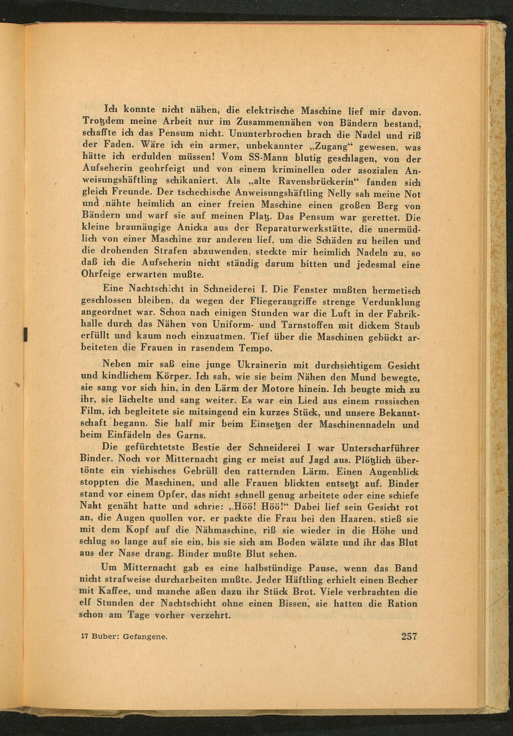Die gefürchtetste Bestie der Schneiderei I war Unterscharführer Binder. Noch vor Mitternacht ging er meist auf Jagd aus. Plötzlich übertönte ein viehisches Gebrüll den ratternden Lärm. Einen Augenblick stoppten die Maschinen, und alle Frauen blickten entsetzt auf. Binder stand vor einem Opfer, das nicht schnell genug arbeitete oder eine schiefe Naht genäht hatte und schrie:„ Höö! Höö!" Dabei lief sein Gesicht rot an, die Augen quollen vor, er packte die Frau bei den Haaren, stieß sie mit dem Kopf auf die Nähmaschine, riß sie wieder in die Höhe und schlug so lange auf sie ein, bis sie sich am Boden wälzte und ihr das Blut aus der Nase drang. Binder mußte Blut sehen.