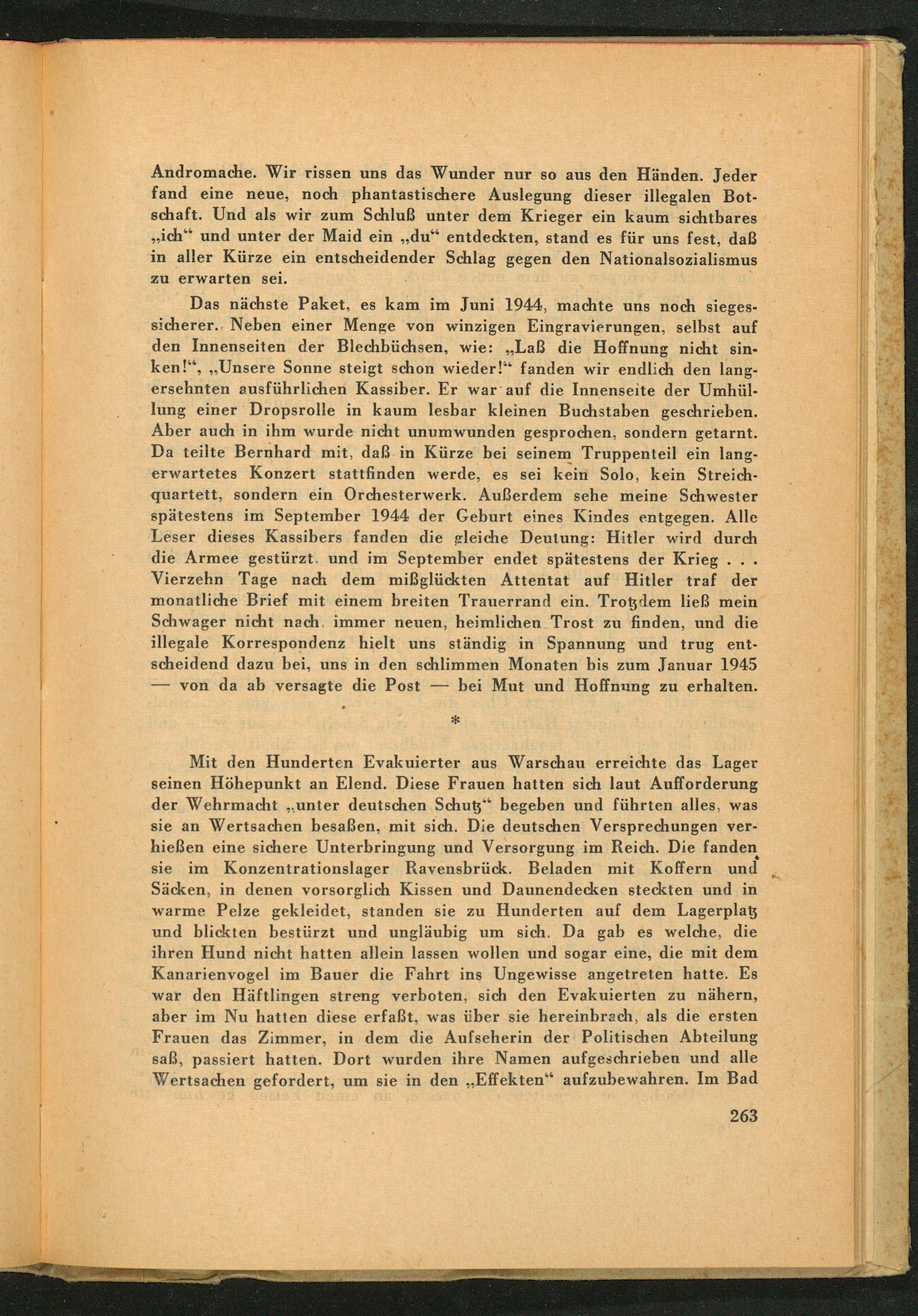 Das nächste Paket, es kam im Juni 1944, machte uns noch siegessicherer. Neben einer Menge von winzigen Eingravierungen, selbst auf den Innenseiten der Blechbüchsen, wie: Laß die Hoffnung nicht sinken!" ,,, Unsere Sonne steigt schon wieder!" fanden wir endlich den langersehnten ausführlichen Kassiber. Er war auf die Innenseite der Umhüllung einer Dropsrolle in kaum lesbar kleinen Buchstaben geschrieben. Aber auch in ihm wurde nicht unumwunden gesprochen, sondern getarnt. Da teilte Bernhard mit, daß in Kürze bei seinem Truppenteil ein langerwartetes Konzert stattfinden werde, es sei kein Solo, kein Streichquartett, sondern ein Orchesterwerk. Außerdem sehe meine Schwester spätestens im September 1944 der Geburt eines Kindes entgegen. Alle Leser dieses Kassibers fanden die gleiche Deutung: Hitler wird durch die Armee gestürzt. und im September endet spätestens der Krieg... Vierzehn Tage nach dem mißglückten Attentat auf Hitler traf der monatliche Brief mit einem breiten Trauerrand ein. Trotzdem ließ mein Schwager nicht nach, immer neuen, heimlichen Trost zu finden, und die illegale Korrespondenz hielt uns ständig in Spannung und trug entscheidend dazu bei, uns in den schlimmen Monaten bis zum Januar 1945 von da ab versagte die Post bei Mut und Hoffnung zu erhalten.