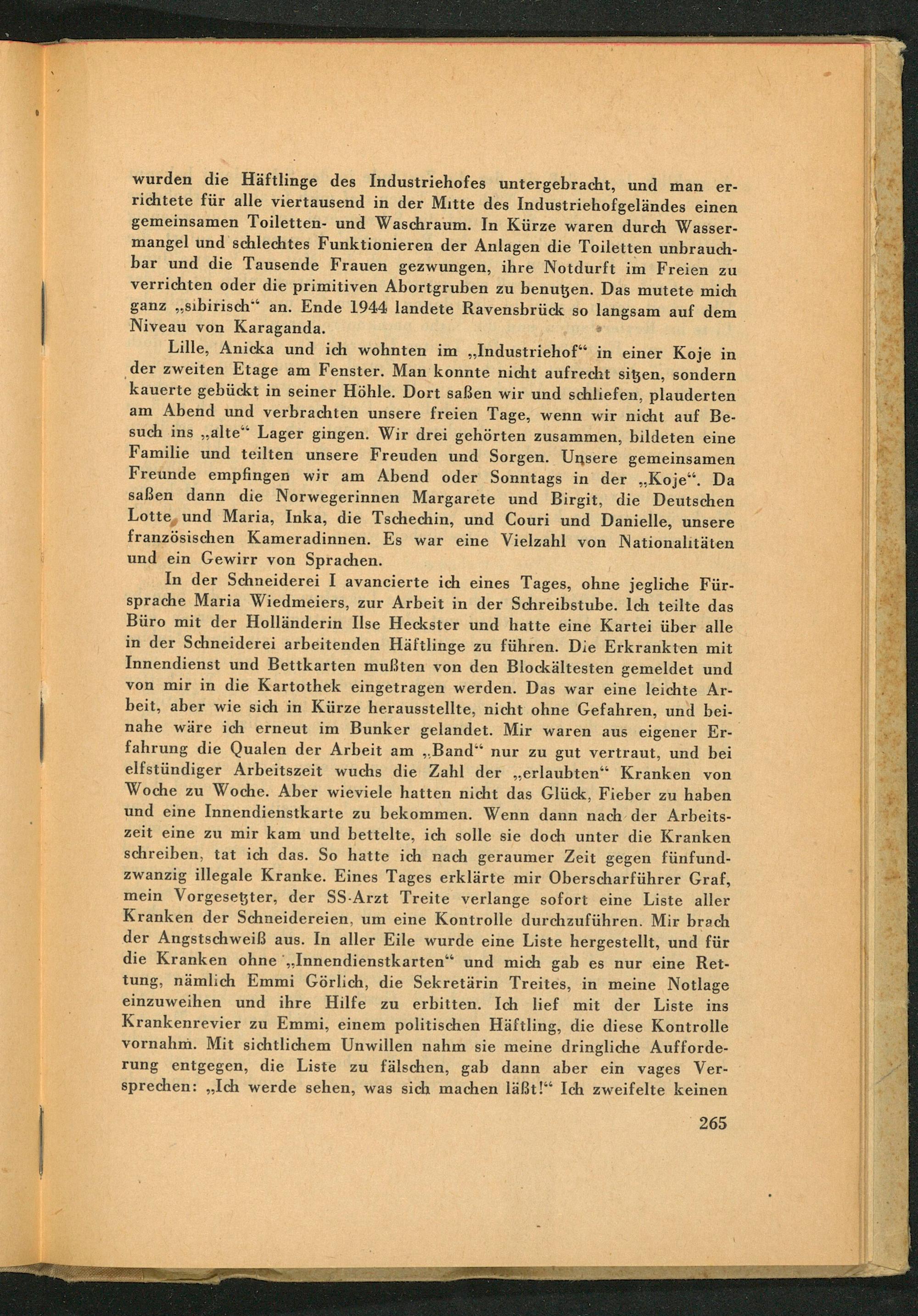 Lille, Anicka und ich wohnten im ,, Industriehof" in einer Koje in der zweiten Etage am Fenster. Man konnte nicht aufrecht sitzen, sondern kauerte gebückt in seiner Höhle. Dort saßen wir und schliefen, plauderten am Abend und verbrachten unsere freien Tage, wenn wir nicht auf Besuch ins ,, alte" Lager gingen. Wir drei gehörten zusammen, bildeten eine Familie und teilten unsere Freuden und Sorgen. Unsere gemeinsamen Freunde empfingen wir am Abend oder Sonntags in der ,, Koje". Da saßen dann die Norwegerinnen Margarete und Birgit, die Deutschen Lotte und Maria, Inka, die Tschechin, und Couri und Danielle, unsere französischen Kameradinnen. Es war eine Vielzahl von Nationalitäten und ein Gewirr von Sprachen.