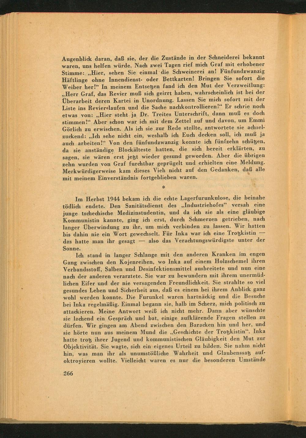Im Herbst 1944 bekam ich die echte Lagerfurunkulose, die beinahe tödlich endete. Den Sanitätsdienst des ,, Industrieho fes" versah eine junge tschechische Medizinstudentin, und da ich sie als eine gläubige Kommunistin kannte, ging ich erst, durch Schmerzen getrieben, nach langer Überwindung zu ihr, um mich verbinden zu lassen. Wir hatten bis dahin nie ein Wort gewechselt. Für Inka war ich eine Trotzkistin das hatte man ihr gesagt also das Verachtungswürdigste unter der Sonne.