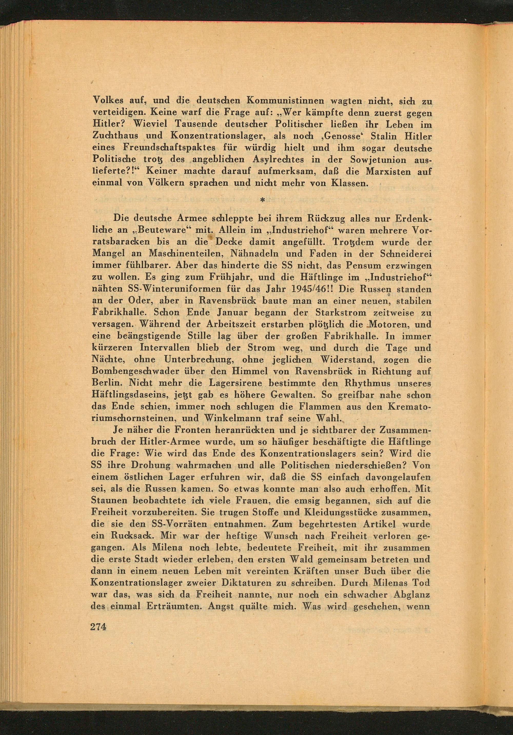 Je näher die Fronten heranrückten und je sichtbarer der Zusammenbruch der Hitler - Armee wurde, um so häufiger beschäftigte die Häftlinge die Frage: Wie wird das Ende des Konzentrationslagers sein? Wird die SS ihre Drohung wahrmachen und alle Politischen niederschießen? Von einem östlichen Lager erfuhren wir, daß die SS einfach davongelaufen sei, als die Russen kamen. So etwas konnte man also auch erhoffen. Mit Staunen beobachtete ich viele Frauen, die emsig begannen, sich auf die Freiheit vorzubereiten. Sie trugen Stoffe und Kleidungsstücke zusammen, die sie den SS - Vorräten entnahmen. Zum begehrtesten Artikel wurde ein Rucksack. Mir war der heftige Wunsch nach Freiheit verloren gegangen. Als Milena noch lebte, bedeutete Freiheit, mit ihr zusammen die erste Stadt wieder erleben, den ersten Wald gemeinsam betreten und dann in einem neuen Leben mit vereinten Kräften unser Buch über die Konzentrationslager zweier Diktaturen zu schreiben. Durch Milenas Tod war das, was sich da Freiheit nannte, nur noch ein schwacher Abglanz des einmal Erträumten. Angst quälte mich. Was wird geschehen, wenn