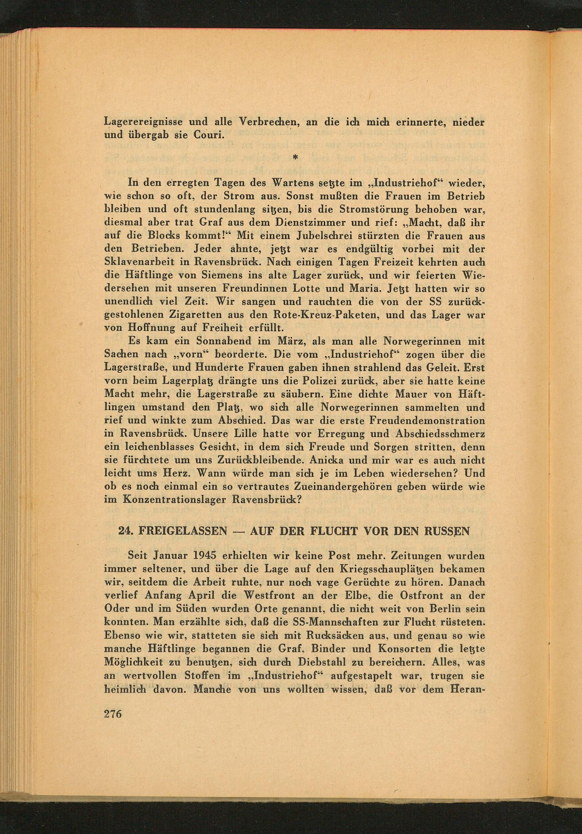 In den erregten Tagen des Wartens setzte im ,, Industriehof" wieder, wie schon so oft, der Strom aus. Sonst mußten die Frauen im Betrieb bleiben und oft stundenlang sitzen, bis die Stromstörung behoben war, diesmal aber trat Graf aus dem Dienstzimmer und rief: ,, Macht, daß ihr auf die Blocks kommt!" Mit einem Jubelschrei stürzten die Frauen aus den Betrieben. Jeder ahnte, jetzt war es endgültig vorbei mit der Sklavenarbeit in Ravensbrück . Nach einigen Tagen Freizeit kehrten auch die Häftlinge von Siemens ins alte Lager zurück, und wir feierten Wiedersehen mit unseren Freundinnen Lotte und Maria. Jetzt hatten wir so unendlich viel Zeit. Wir sangen und rauchten die von der SS zurückgestohlenen Zigaretten aus den Rote- Kreuz- Paketen, und das Lager war von Hoffnung auf Freiheit erfüllt.