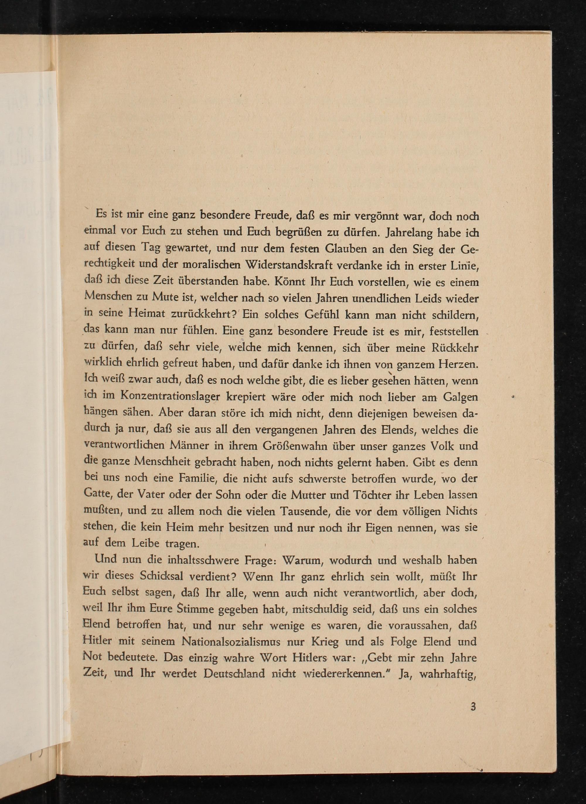 _ Es ist mir eine ganz besondere Freude, daß es mir vergönnt war, doch noch einmal vor Euch zu stehen und Euch begrüßen zu dürfen. Jahrelang habe ich auf diesen Tag gewartet, und nur dem festen Glauben an den Sieg der Ge- rechtigkeit und der moralischen Widerstandskraft verdanke ich in erster Linie, daß ich diese Zeit überstanden habe. Könnt Ihr Euch vorstellen, wie es einem Menschen zu Mute ist, welcher nach so vielen Jahren unendlichen Leids wieder in seine Heimat zurückkehrt? Ein solches Gefühl kann man nicht schildern, das kann man nur fühlen. Eine ganz besondere Freude ist es mir, feststellen zu dürfen, daß sehr viele, welche mich kennen, sich über meine Rückkehr wirklich ehrlich gefreut haben, und dafür danke ich ihnen von ganzem Herzen. Ich weiß zwar auch, daß es noch welche gibt, die es lieber gesehen hätten, wenn ich im Konzentrationslager krepiert wäre oder mich noch lieber am Galgen hängen sähen. Aber daran störe ich mich nicht, denn diejenigen beweisen da- durch ja nur, daß sie aus all den vergangenen Jahren des Elends, welches die verantwortlichen Männer in ihrem Größenwahn über unser ganzes Volk und die ganze Menschheit gebracht haben, noch nichts gelernt haben. Gibt es denn bei uns noch eine Familie, die nicht aufs schwerste betroffen wurde, wo der Gatte, der Vater oder der Sohn oder die Mutter und Töchter ihr Leben lassen mußten, und zu allem noch die vielen Tausende, die vor dem völligen Nichts stehen, die kein Heim mehr besitzen und nur noch ihr Eigen nennen, was sie auf dem Leibe tragen.